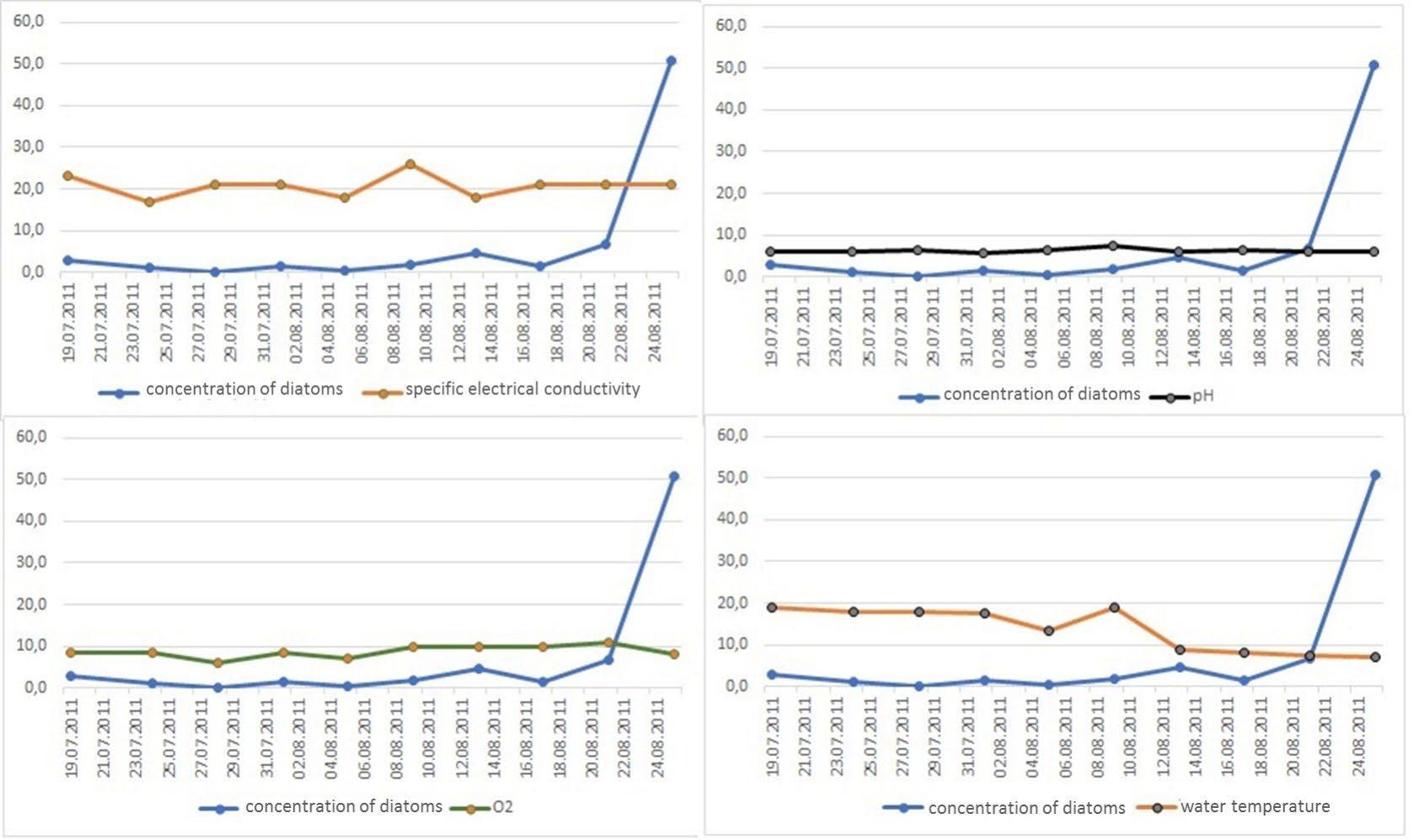 An analysis of the comparison of the ratios between the concentration of diatom flaps in phytoplankton with the physical parameters of water (water temperature, pH, electrical conductivity and oxygen concentration) of a model reservoir, measured in the field using loggers, is shown in figure 1. Judging by the graphs, all the measured indicators are fairly evenly correlated with each other. It can be seen that the value of the concentration of the flaps reacts relatively well to changes in water temperature – with a decrease in the temperature index, the number of registered flaps increases. This may indicate that mainly cold-water species live in polygonal reservoirs of the Arctic, at a water temperature of 7.2 ° C (one of the minimum values for the entire sample), the concentration of flaps reached 50.9 million/l, while at the highest temperature up to 19 ° C, the concentration of flaps was equal to 2.8 and 1.8 million/l.