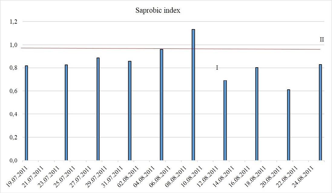 In order to determine the water quality of the studied lakes, saprobity indices were calculated using 41 types of diatoms-saprobity indicators. Of these, 9 species characterize the oligosaprobic zone, 5 – beta-mesosaprobic, 4 – xenosaprobic and 1 – alpha-mesosaprobic. Calculated indices of saprobity by diatoms for the studied lakes range from 0.6 to 1.1, i.e. in terms of pollution they belong to class I “very clean” and class II water quality “clean” (Fig. 2). At the same time, a relatively high saprobity index was noted on 09.08, when all measured water parameters were high.