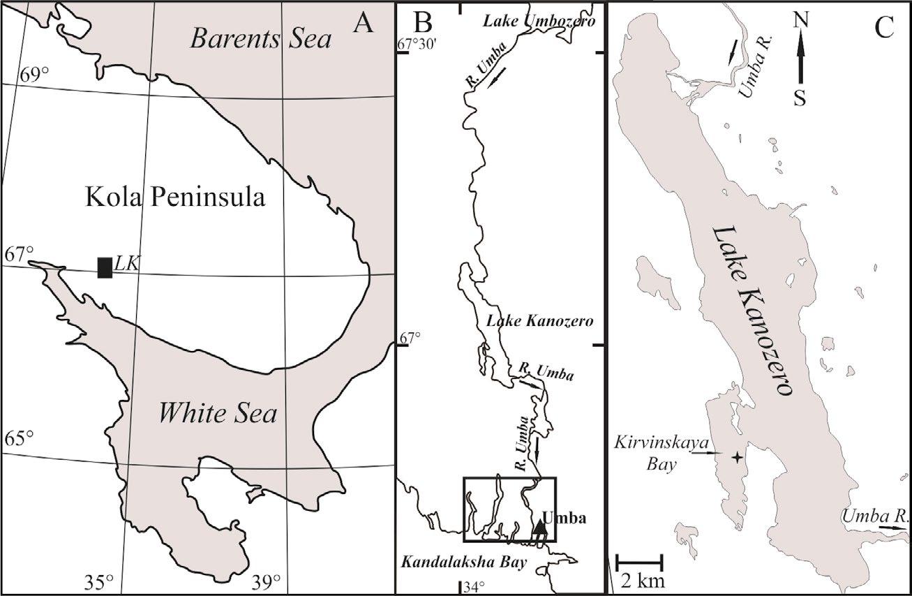 Lake Kanozero (67°3’33” N, 34°6’12” E, 52.7 m a.s.l.) is a large basin (area 84.3 km2, water volume 0.27 km3, mean depth 3.2 m, max depth 10.6 m (Resursy…, 1970)) in the middle course of the River Umba (Fig. 1B). As the River Umba inflows to and outflows from the lake, it can be also considered a large spill on the river. The lake basin is NW-SE-oriented and has an elongated shape. The distance from its SE end to the White Sea coast is ca. 28 km.