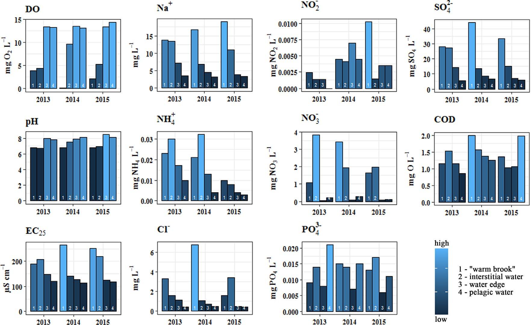 Hydrochemical parameters of different water samples were analyzed: (1) water collected from the “warm brook”, (2) interstitial water from a hole on the target beach, (3) the water from the lake’s edge, (4) the lake’s pelagic water (Fig. 6). In our case, the oxygen concentration in the water was one of the most indicative characteristics. It is quite clear that the oxygen content was significantly lower in the hole and “warm brook” comparing the lake’s water. We noted the oxygen concentration was close to zero in the water from the “warm brook” in 2014. As for the pH, its measurements displayed stable low alkalinity in the water edge’s and pelagic samples (~8), whereas the “warm brook” and the hole values were closer to neutral. The electrical conductivity in the “warm brook” during 2014–2015 testified to a moderately increased water mineralization there (up to 250 µS cm-1).