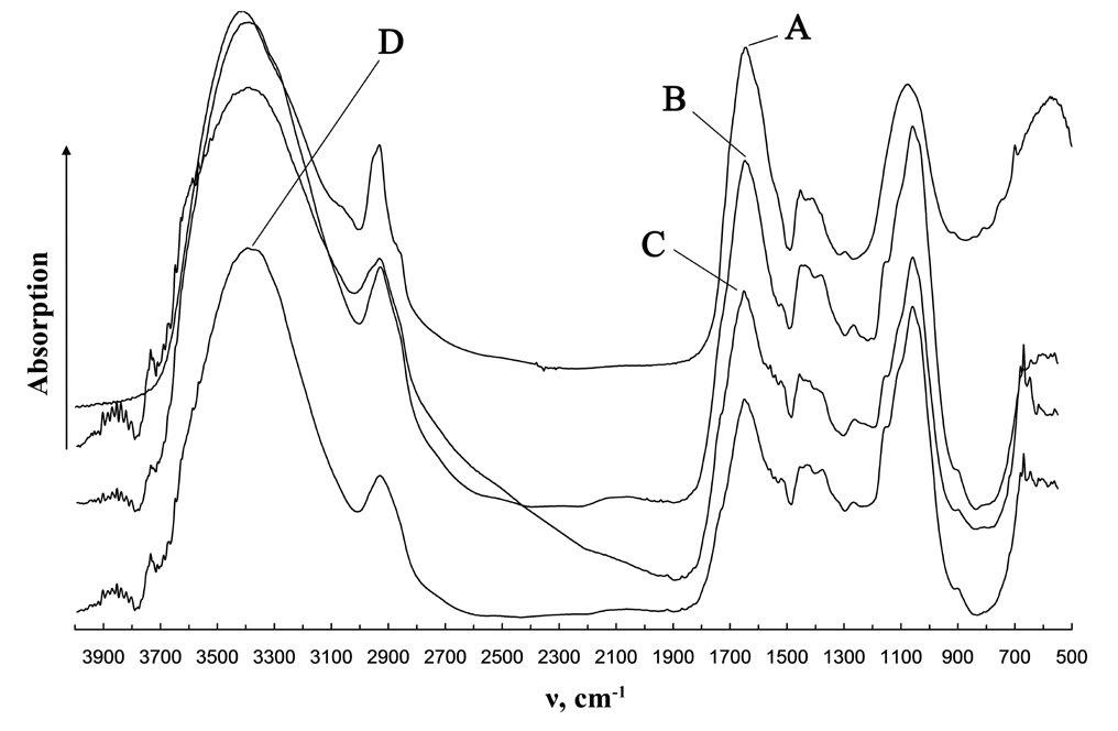 Fig.9. FTIR spectroscopy analysis of the depositions on the stones from the beach next to the BPPM site compared to the data on pulp production wastes. (A) Acid-precipitated alkaline washout from a stone. (B), (D) Untreated sludge-lignin. (C) Dry residue of the BPPM wastewaters.
