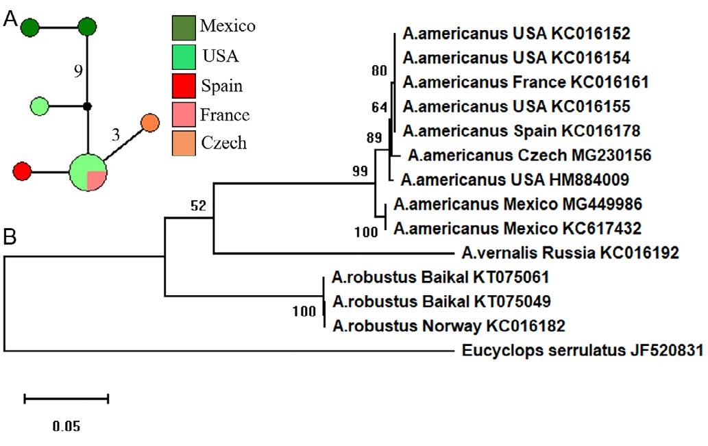 Fig.1. A) Median joining networks of the mitochondrial cytochrome oxidase subunit I (COI) of the mtDNA gene from Acanthocyclops americanus (Marsh, 1893) retrieved from GenBank. The black dot indicates the median vector. B) Maximum likelihood phylogenetic tree based on COI sequences of A. americanus using 13 sequences retrieved from GenBank. Bootstrap values for maximum likelihood (ML) (≥ 50%) are given for nodes. Accession numbers are given after the species name and geographical location. Acanthocyclops vernalis (Fischer, 1853), Acanthocyclops robustus (Sars G.O., 1863) and Eucyclops serrulatus (Fischer, 1851) are used as outgroups.