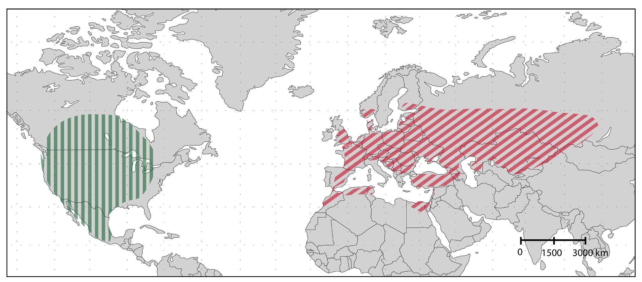 Fig.3. Confirmed native area (in green) of Acanthocyclops americanus (Marsh, 1893) and the extent of its invasion in the Palearctic (in red).