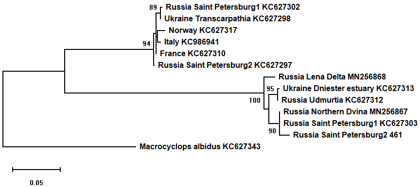 The phylogenetic tree that we made based on the sequences from the database GenBank (Fig. 1) and the original ones from the habitat types of three these Acanthocyclops species show that A. americanus from the United States, Mexico, the Czech Republic and Spain are practically identical, while the European forms, A. vernalis from Russia and A. robustus from Norway, are clearly separated from them. It is interesting to note that the distribution of native Acanthocyclops species most likely covers the entire Palearctic, which is confirmed by the discovery of forms very close to A. robustus in the area of Lake Baikal (see Fig. 1), 5000 km away from Norway and separated by mountain ranges and catchments of several large rivers.