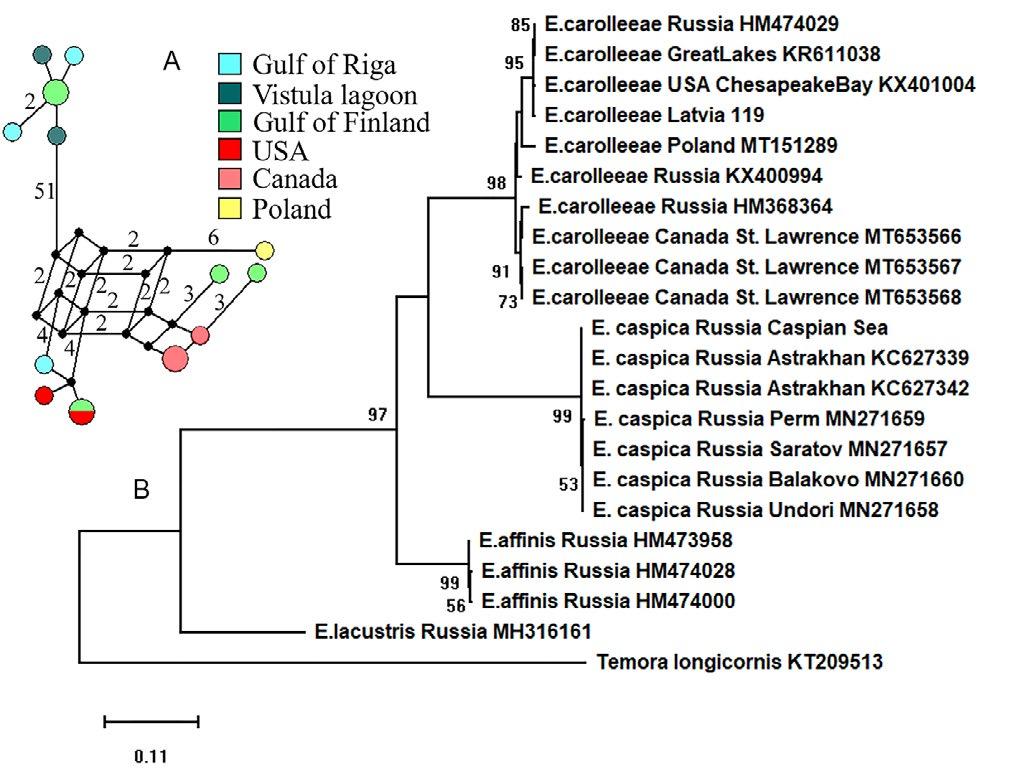 Fig.7. A) Median joining networks of the mitochondrial cytochrome oxidase subunit I (COI) mtDNA gene from Eurytemora affinis (Poppe, 1880) (upper) and Eurytemora carolleeae Alekseev et Souissi, 2011 (lower) retrieved from GenBank. Black dots indicate median vectors. B) Maximum likelihood phylogenetic tree based on COI sequences of E. carolleeae, E. affinis and Eurytemora caspica Sukhikh et Alekseev, 2013, constructed using the 22 sequences retrieved from GenBank. Bootstrap values for maximum likelihood (ML) (≥ 50%) are given for the nodes. Accession numbers are given after the species name and geographical location. Eurytemora lacustris (Poppe, 1887) and Temora longicornis (Müller O.F., 1785) were used as outgroups.
