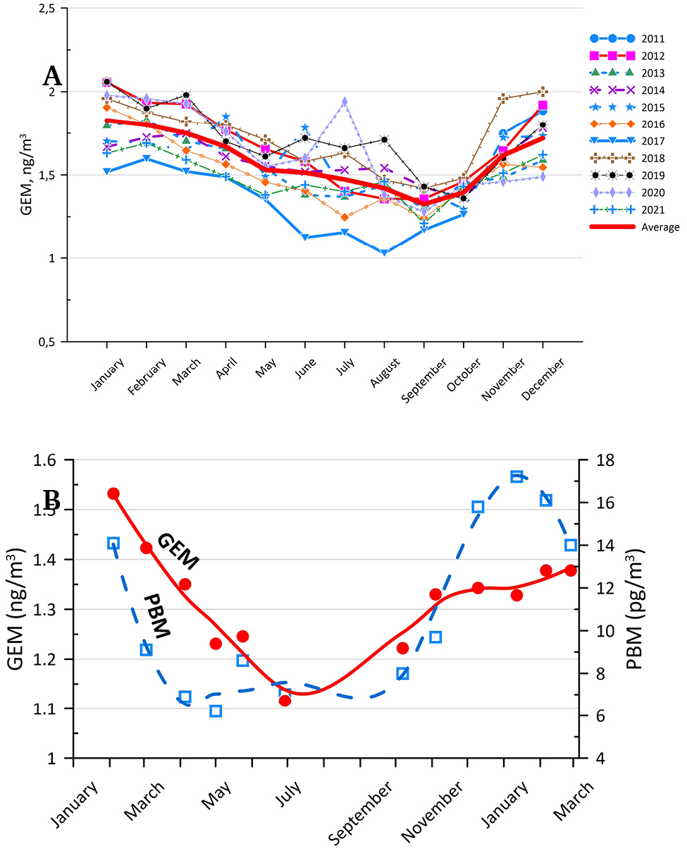 The obtained data show an obvious seasonal variation in the background mercury concentration in air (both GEM and PBM), increasing in the cold seasons (November – February) with the mean GEM of 1.74 (1.56 - 1.95) ng/m3, and decreasing in warm seasons (June – September) averaging 1.43 (1.12 – 1.63) ng/m3 (Fig. 1A); the same seasonal variation shows PBM since January 2016 to March 2017 (Fig. 1B).