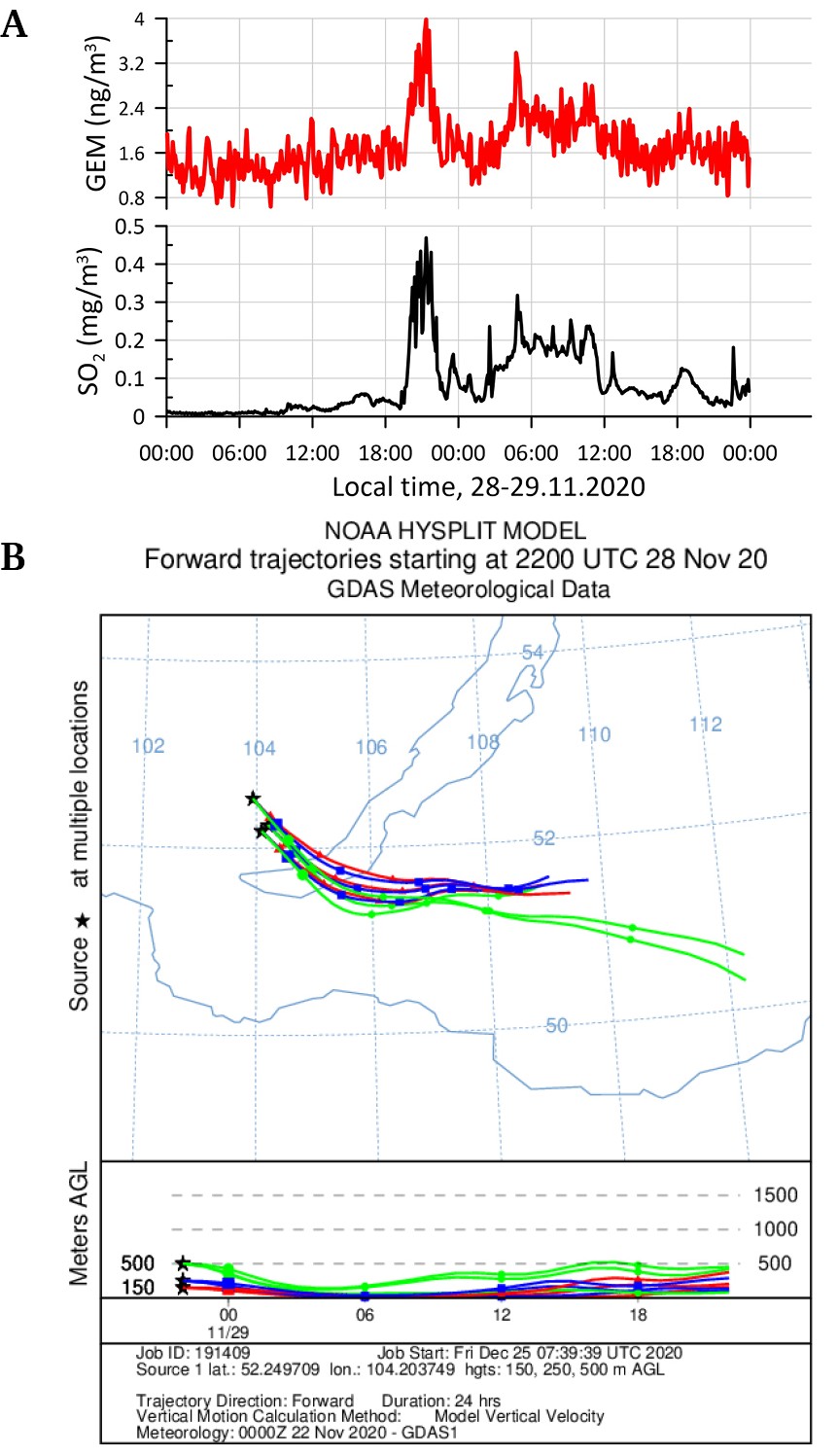 To assess the relationship between mercury and acid gas anomalies recorded at the Listvyanka station and the sources of industrial emissions, we used the HYSPLIT model (Cheng et al., 2013; 2015; Rolph et al., 2017) with air mass trajectory calculation at the three vertical levels of 50, 150 and 500 m. An example of long-distance transport of air pollutants is shown in Fig. 2. The correlated maxima of SO2 and GEM concentrations at the Listvyanka monitoring station are observed during superposition of air masses carrying plumes of coal-fired power plants from the Angarsk, Irkutsk and Shelekhov cities (Mashyanov et al., 2021).