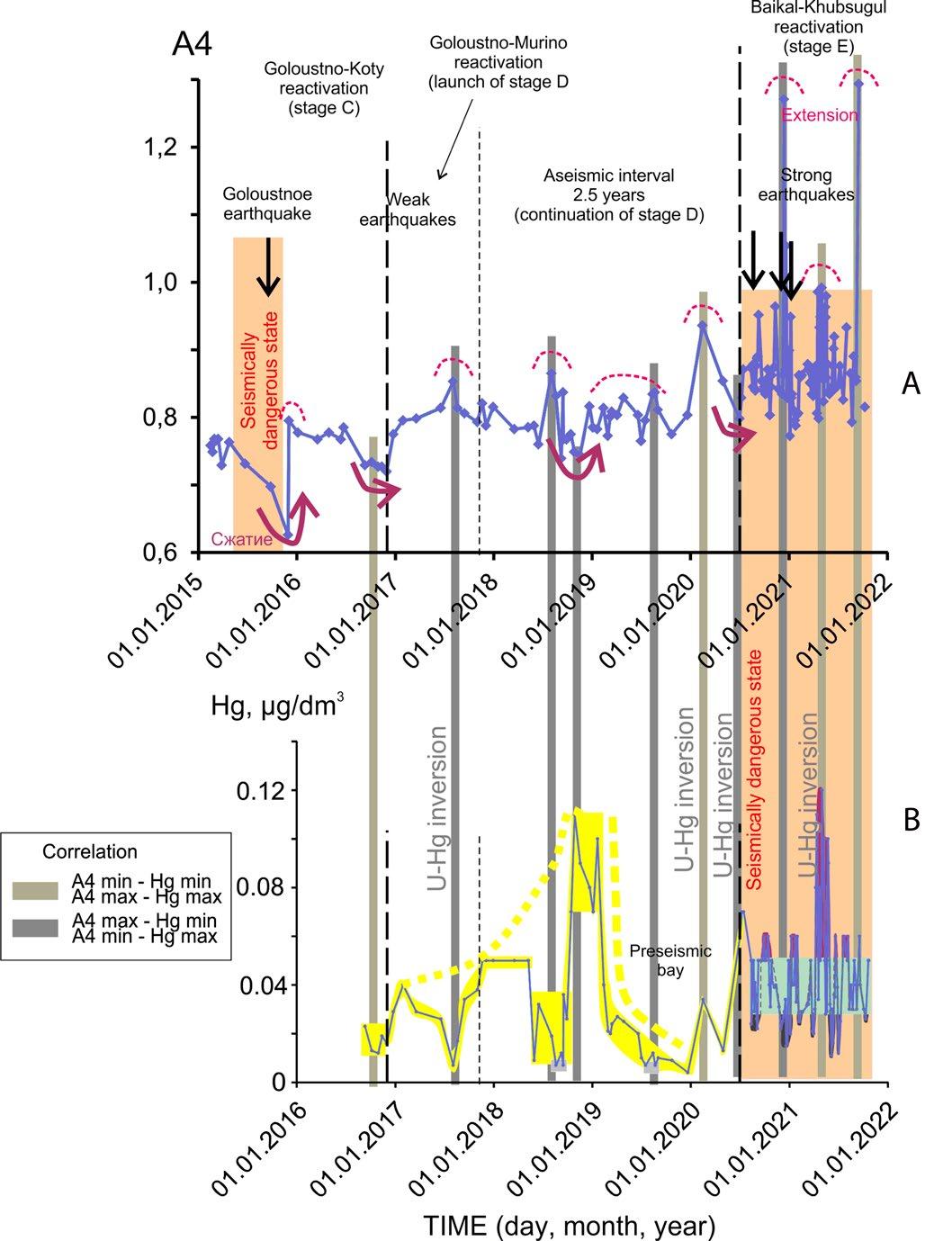 Fig. Transition from crustal compression of 2015 to extension of 2020–2021 in terms of maxima and minima of А4 (A) and maxima and minima of Hggw (B) in the groundwater time series of station 27 (Kultuk area).