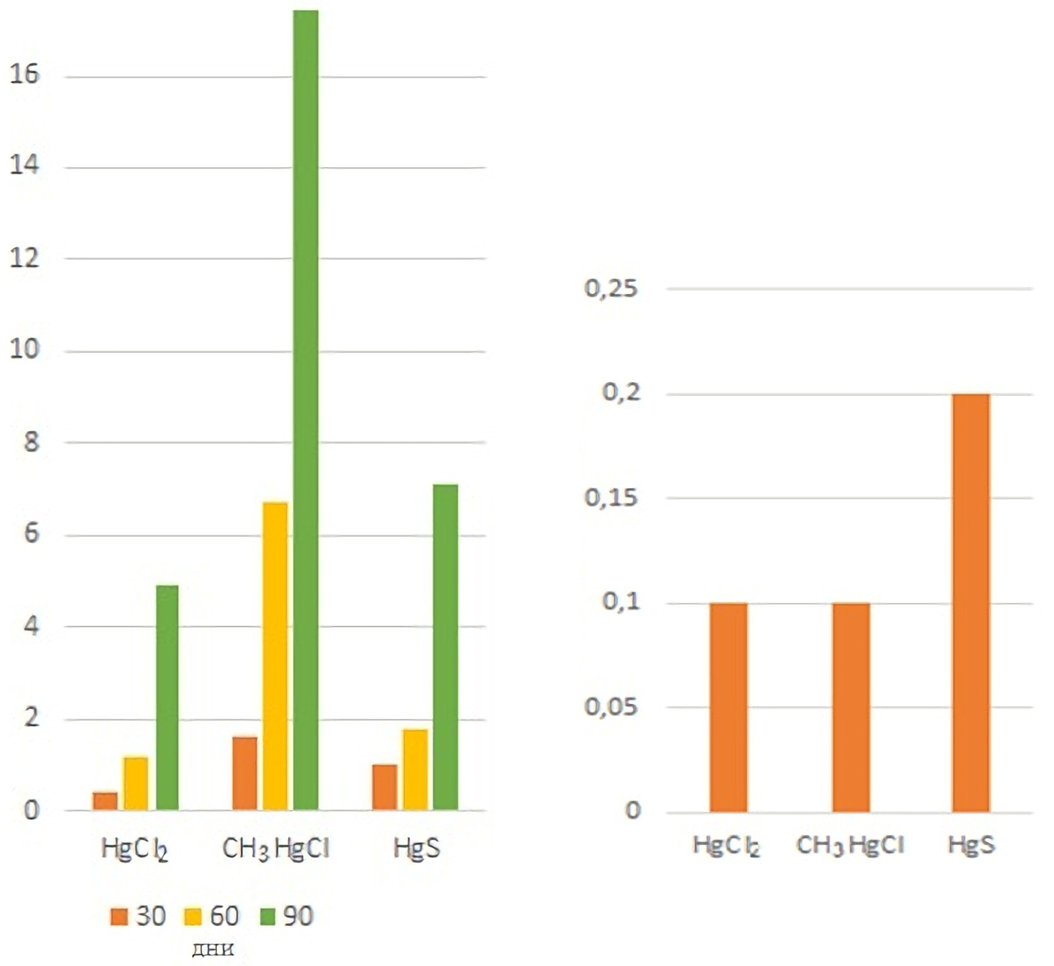 It was obvious that the plants extracted mercury most intensively from the environment containing methylmercury chloride: BCF values within 90 days of the experiment increased from 1.6 to 17.4.