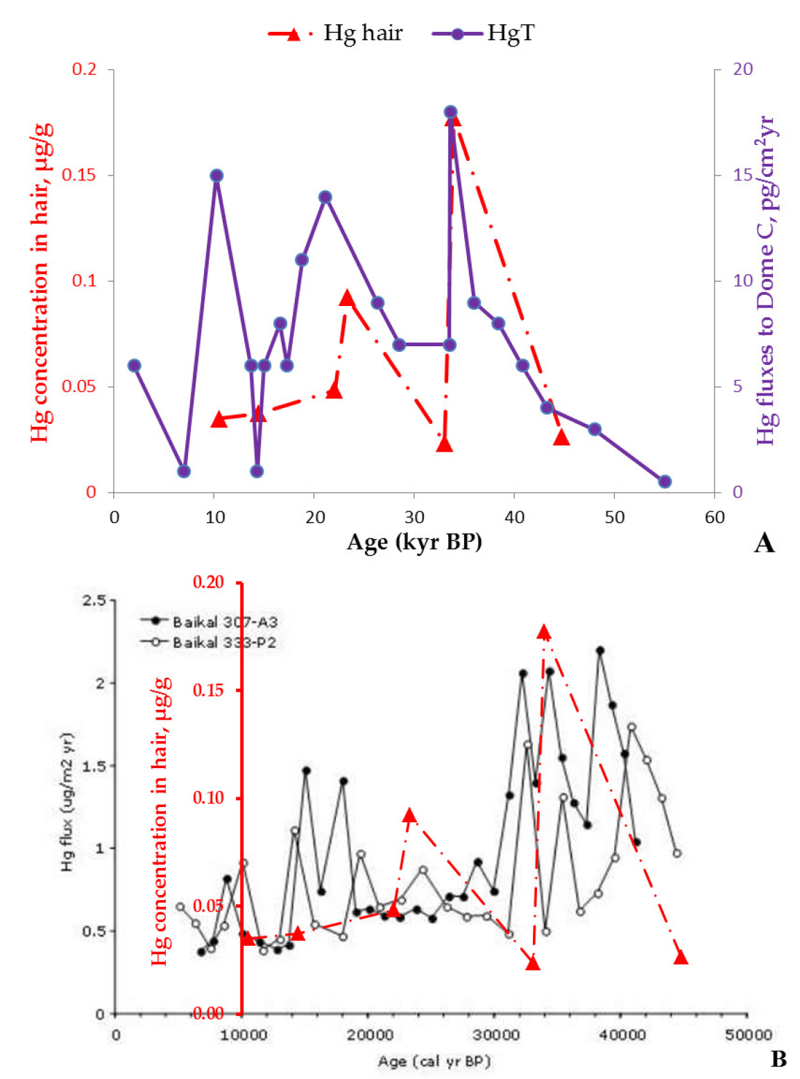 Fig.2. Total Hg concentrations in mammoth fauna mammals’ hair and fluxes of total mercury (HgT) in the EPICA Dome C ice core (A) (data taken from Jitaru, 2009_SI) and Hg accumulation in Lake Baikal (B) (Lamborg, 2011).