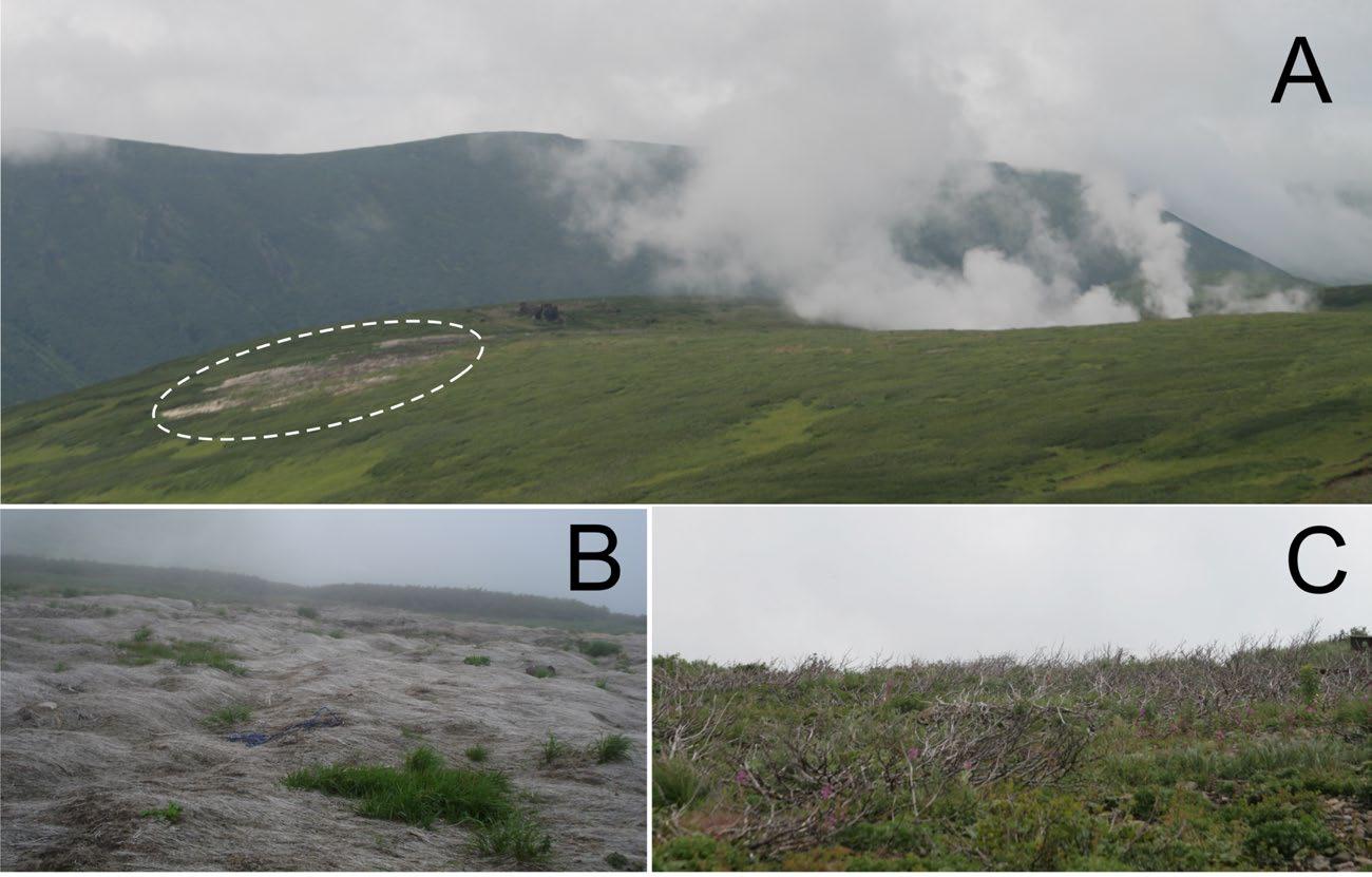 Fig.1. Nizhne-Koshelevskoe Novoe thermal field: A – general view (marked by a dotted line); B – grass burnout in the field area; C – bush burnout in the field area.