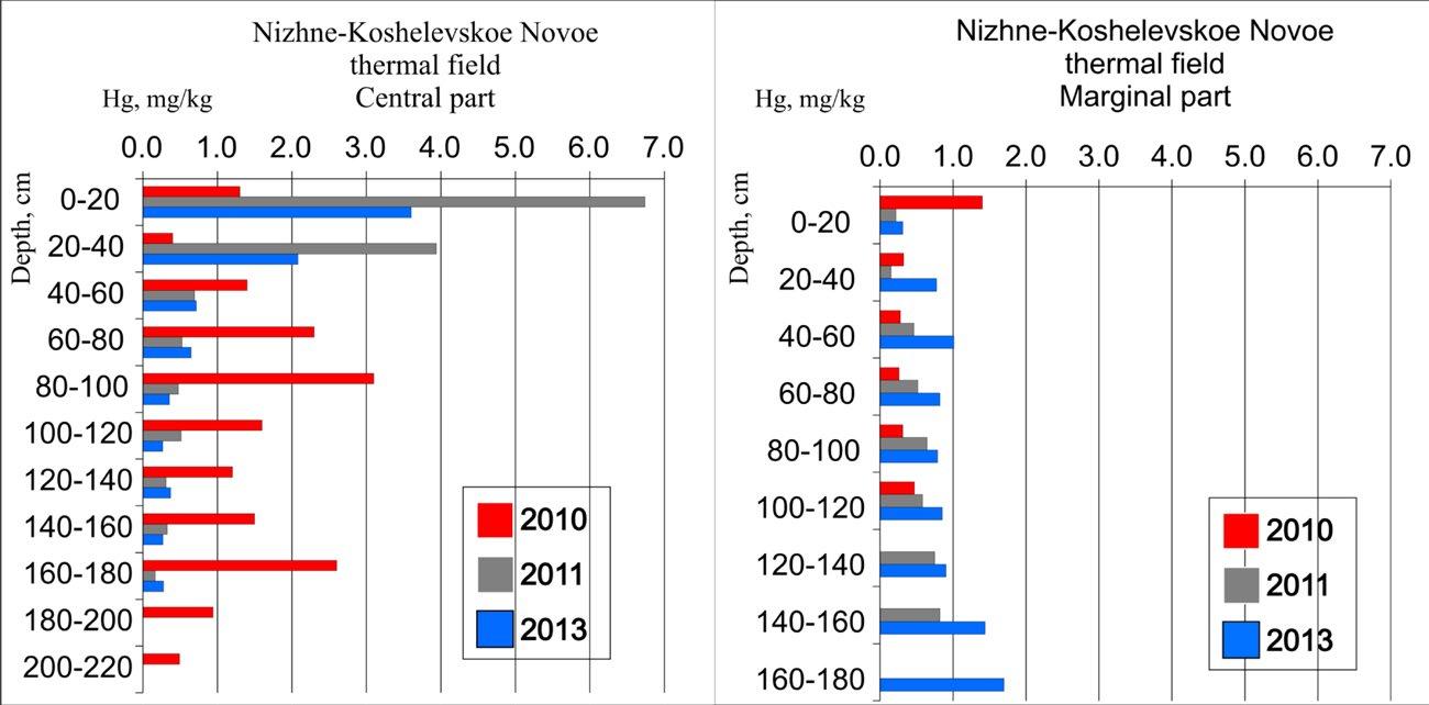 In 2008, on the western slope of the Koshelevsky volcanic massif, near the Nizhne-Koshelevskoe thermal field (300 m to the south), there was a rare natural phenomenon, a formation of the new thermal field that was called Nizhne-Koshelevsloe Novoe (Rychagov et al., 2014). Heating of this site lasted about two years, and then cooling followed. The formation of this thermal field was associated with widespread hydrothermal processes in this area and the closely located Nizhne-Koshelevskoe thermal field (Fig. 1), which the geophysical research conducted here confirmed (Nuzhdaev and Feofilaktov, 2013). The study of mercury concentration in the strata of soil-pyroclastic deposits in the Nizhne-Koshelevskoe Novoe field allowed us to examine in detail the behaviour of mercury under near-surface conditions during the formation and decay of a thermal anomaly. For this purpose, in the 2010, 2011 and 2013 fieldwork seasons, the wells were traversed in the central and marginal parts of the field area. Each stage was characterised by the individual distribution of mercury in the section.
