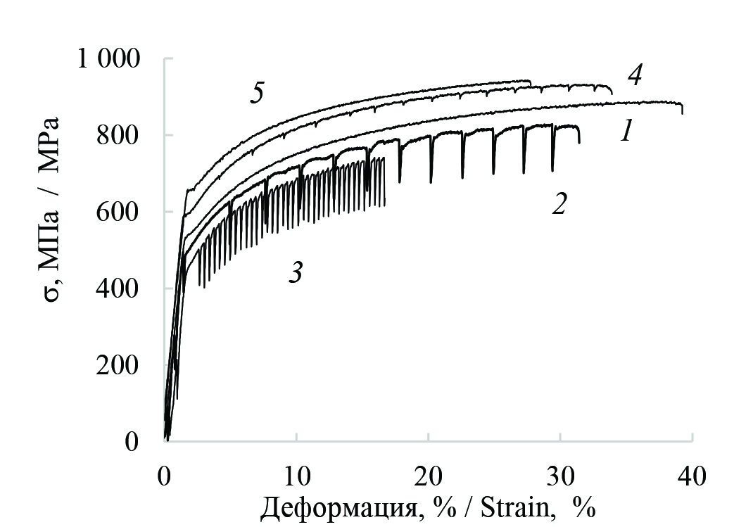 Кривые 4 и 5 сдвинуты вверх на 50 МПа по оси Y, чтобы избежать наложения