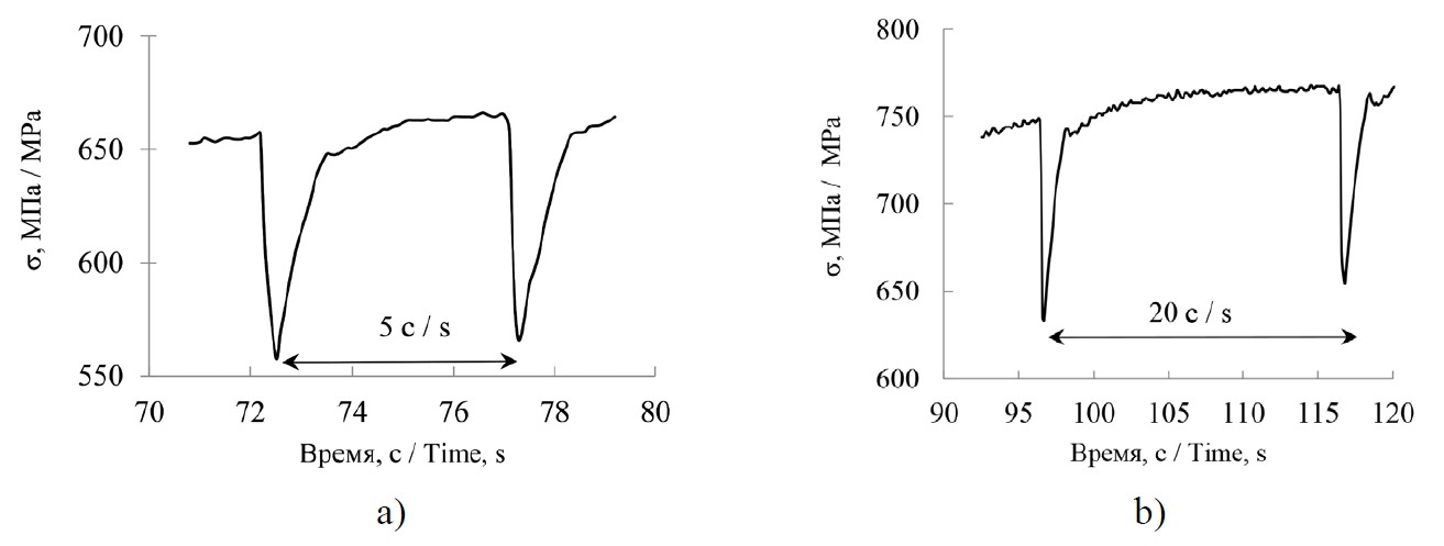На рисунке 3 иллюстрируется влияние скважности при одинаковой плотности тока и длительности импульса на взаимное расположение скачков напряжения, а также их форму и амплитуду в бронзе БрАЖ9-4-4. Четырехкратное повышение скважности с 5 000 до 20 000 привело к слабому увеличению амплитуды скачка напряжений с 110 до 120 МПа и действующих напряжений течения. Независимо от скважности форма скачка напряжений является ассиметричной. Снижение напряжения в скачке (левая часть) происходит почти на порядок быстрее, чем его восстановление (правая часть).