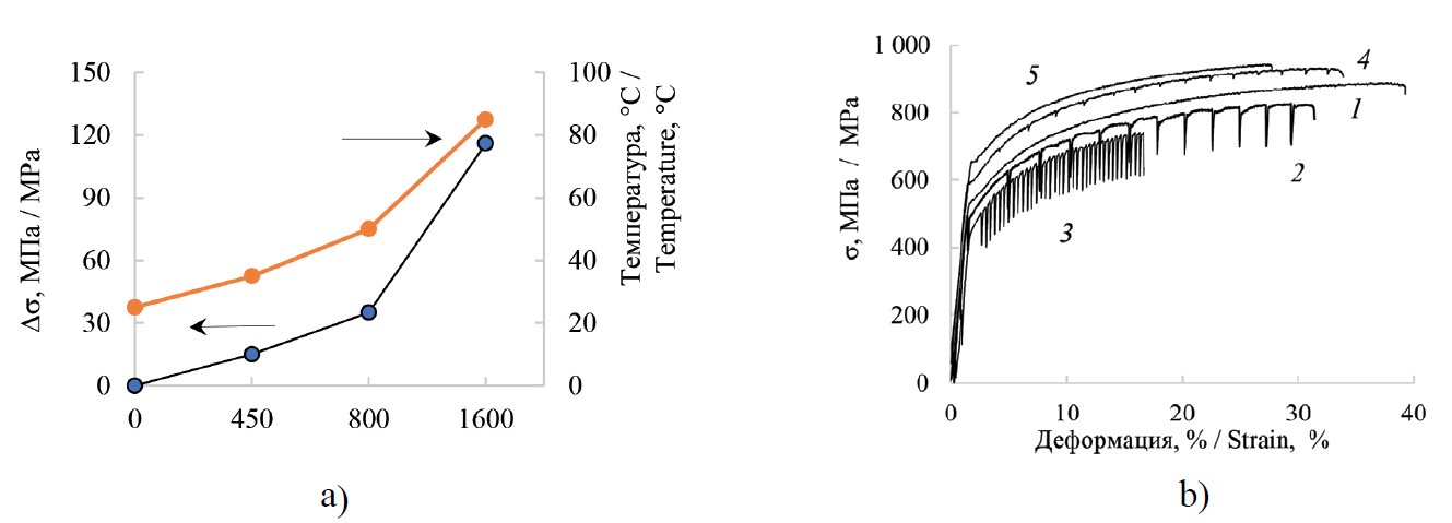Поскольку кривые растяжения при многократном изменении плотности тока в реальном масштабе напряжений накладываются друг на друга, они были смещены относительно друг друга по оси Y так, чтобы можно было оценить амплитуду скачков. Типичные скачки напряжения, соответствующие ЭПЭ, появляются только при плотности тока выше jкр ≥ 450 А/мм2 (кривая 2). Дальнейшее повышение плотности тока до 1 600 А/мм2 способствовало увеличению амплитуды скачка напряжения от нескольких МПа до 40 МПа (кривые 3 и 4), снижению относительного удлинения на 10 % и практически не влияло на напряжения течения. На рисунке 4b показана зависимость амплитуды скачка напряжения от плотности тока и температуры.
