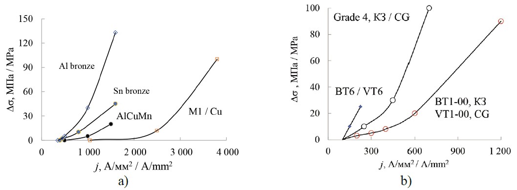 Аналогичные испытания были выполнены для материалов, заметно отличающихся величиной удельного электросопротивления. Соответствующие зависимости амплитуды скачков напряжения от плотности тока показаны для сплавов на основе алюминия, меди (рис. 5а) и титана (рис. 5b). Все кривые носят экспоненциальный характер, отличающийся показателем степени. Видно, что для каждого материала существует своя критическая (пороговая) плотность тока jкр, ниже которой ЭПЭ не проявляется, а выше этого значения амплитуда скачка повышается с увеличением плотности тока по экспоненте.