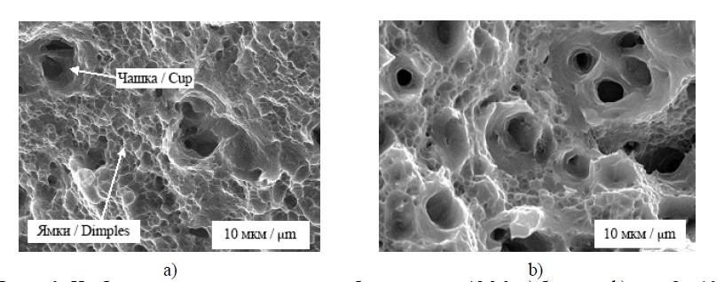 Однако снижение скважности импульсного тока приводит к увеличению доли чашек и появлению пор. Для примера на рисунке 6 показаны изображения изломов в растровом микроскопе для алюминиевого сплава АМг2. Видно, что введение импульсного тока низкой скважности способствует увеличению количества и размеров чашек в изломе, тогда как доля ямок заметно снижается (рис. 6b).