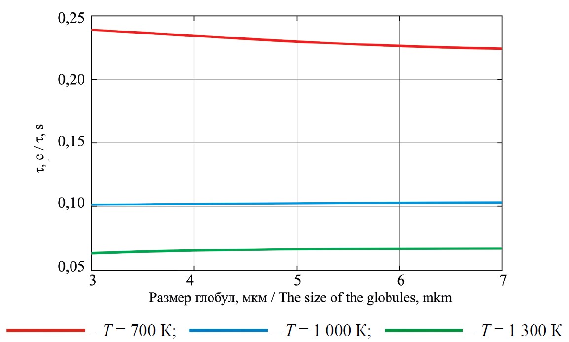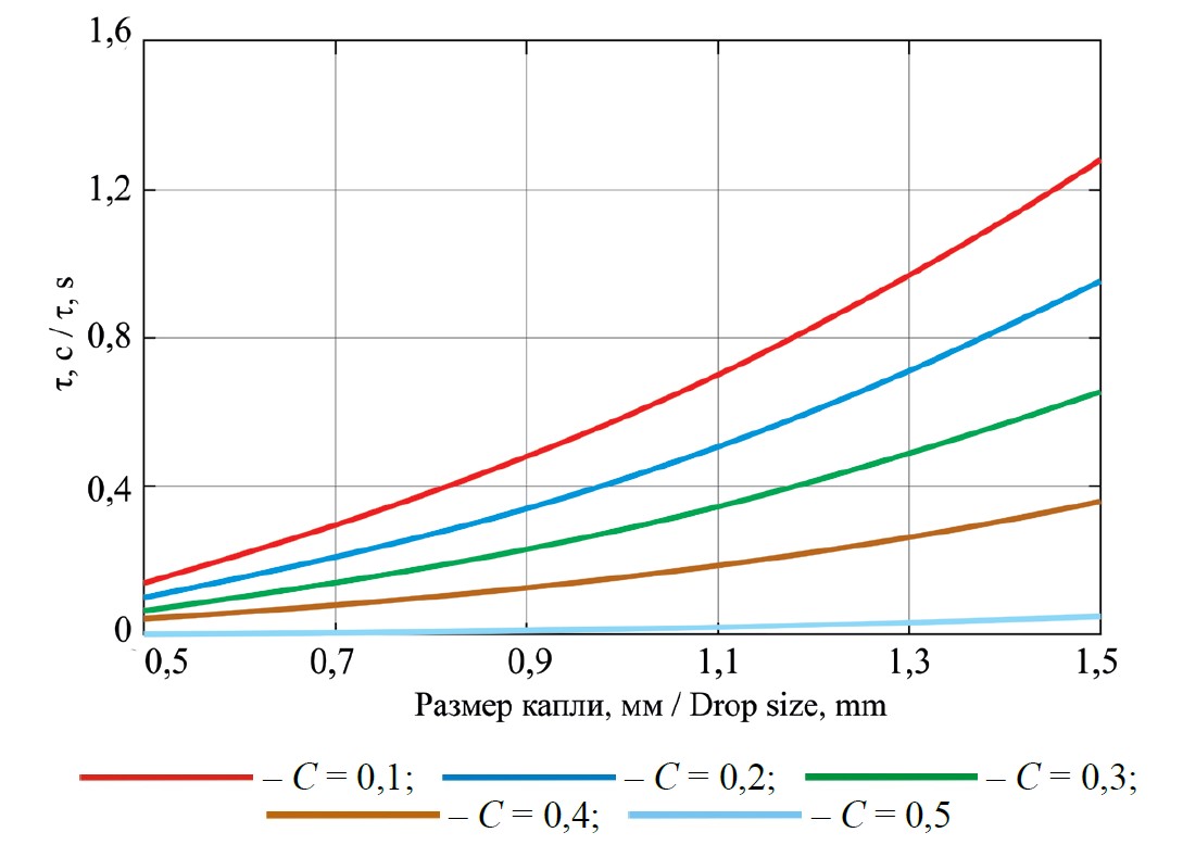 Учитывая влияние на динамику испарения периода пульсаций таких параметров, как дисперсность и размер капель, концентрация воды в составе эмульсии, процесс испарения перед воспламенением капли ВТЭ выглядит весьма непросто [31–33]. Вместе с тем пульсирующее поведение капли ВТЭ при испарении вызывает у ученых наибольший интерес, поскольку при решении задач моделирования необходимо учитывать достаточно медленный процесс накопления в объеме капли пара, что в свою очередь требует рассмотрения задачи в квазистационарной постановке. Основной целью при выполнении вычислений является изучение изменения температурных характеристик капли, воды и пара в динамике, а характеристики периода пульсации от концентрации воды в эмульсии (рис. 2), температуры среды (рис. 3), начального размера капли (рис. 4) и размеров глобул воды (рис. 5) можно определить с помощью численного моделирования релаксационных колебаний поверхности капли ВТЭ [31].