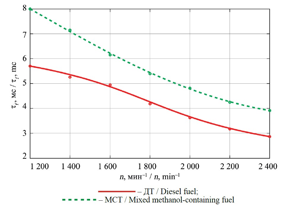 Для учета особенностей процесса сгорания МСТ дополним основополагающие теоретические соотношения, основанные на законах химической кинетики при сгорании ДТ, соответствующими эмпирическими коэффициентами, учитывающими эти особенности. Поскольку на рассматриваемом ДД нами был проведен весь цикл экспериментальных испытаний при работе его на МСТ (состав МСТ: 25 % – метанол; 0,5 % – сукцинимид С-5А; 7 % – вода; 67,5 % – ДТ) [27], то значения этих коэффициентов получаем путем идентификации математической модели процесса сгорания МСТ по экспериментальным характеристикам тепловыделения [27; 29].