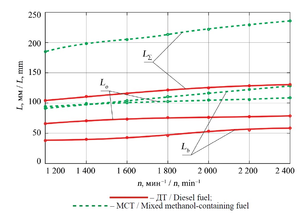 Discussion and Conclusion. There has been developed a theoretical basis for calculating the characteristics of injecting and spraying methanol-containing fuel that makes it possible to optimize the operation of a diesel engine running on mixed fuel and, as a result, improve its efficiency and eco friendliness. The presented numerically information on the change in the boundaries of the fuel jet forming areas, the size of the droplets and the angle of the spraying cone allows us to reliably determine the basic parameters of spraying of the used mixed methanol-containing fuels, determine the vector of optimization of the mixing processes and gives insight into the promising directions in designing the geometry of combustion chambers, intake ducts, etc.