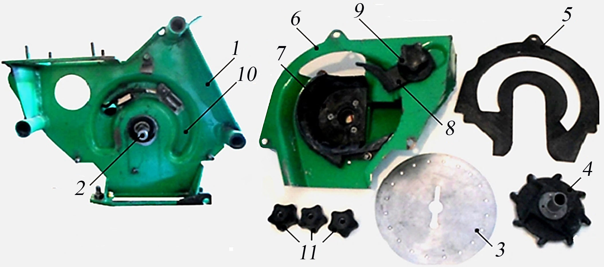 Материалы и методы. Исследование проводилось экспериментальным путем при высеве ВВА сеялки МС-8 [34], получившей широкое распространение на юге Российской Федерации, семян кукурузы и подсолнечника (рис. 1). Рассматриваемый ВВА содержит оригинальный штампо-сварной корпус 1, в котором посредством подшипникового узла установлен приводной вал 2, на котором фиксируются высевающий диск 3 и ворошитель семян 4. Для исключения трения высевающего диска 3 о корпус 1 между ними располагается полиамидная прокладка 5. С другой стороны к высевающему диску 3 примыкает крышка 6 с семенной камерой 7, также выполненной из полиамида. В крышке 6 размещается сбрасыватель «лишних» семян 8 с регулировочным механизмом 9. Крышка 6 фиксируется у корпуса 1, в котором изготовлена вакуумная камера 10, связанная с пневмосистемой сеялки разъемными соединениями 11.