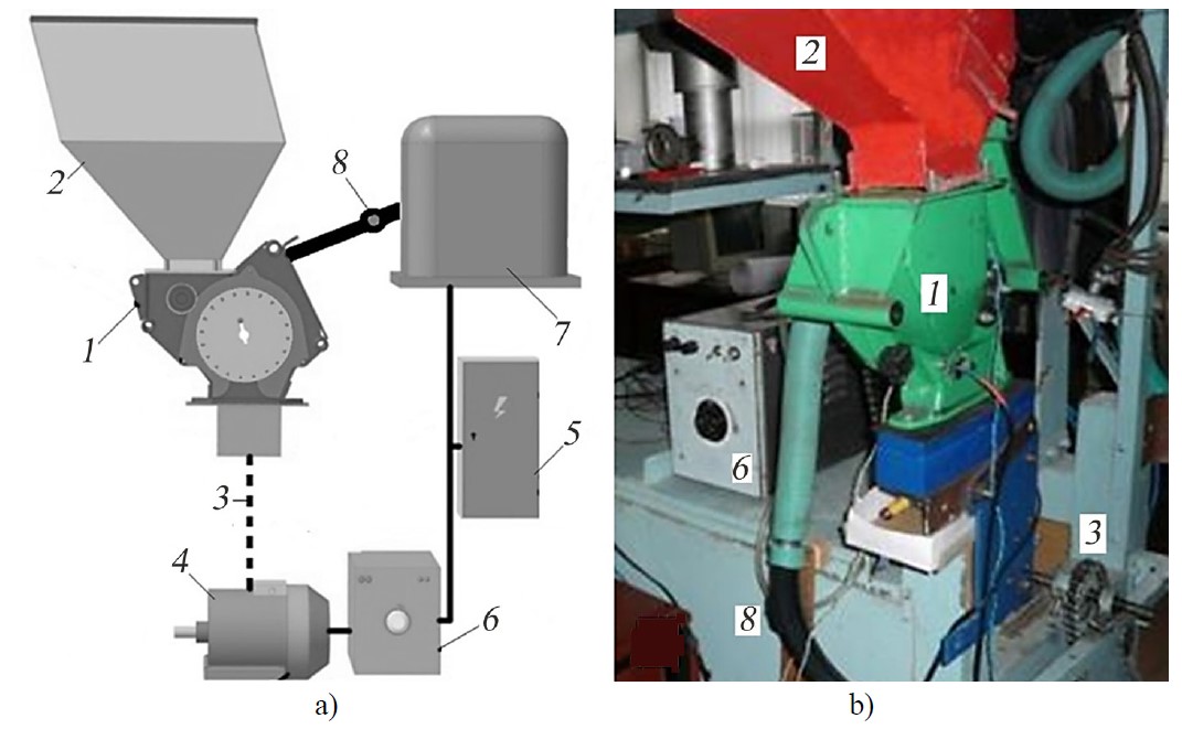 a) installation diagram; b) appearance of the stand; 1 – VVA; 2 – bunker; 3 – chain drives; 4 – DC motor; 5 – source of electricity; 6 – autotransformer (LATR); 7 – ejector-type vacuum generator; 8 – throttle