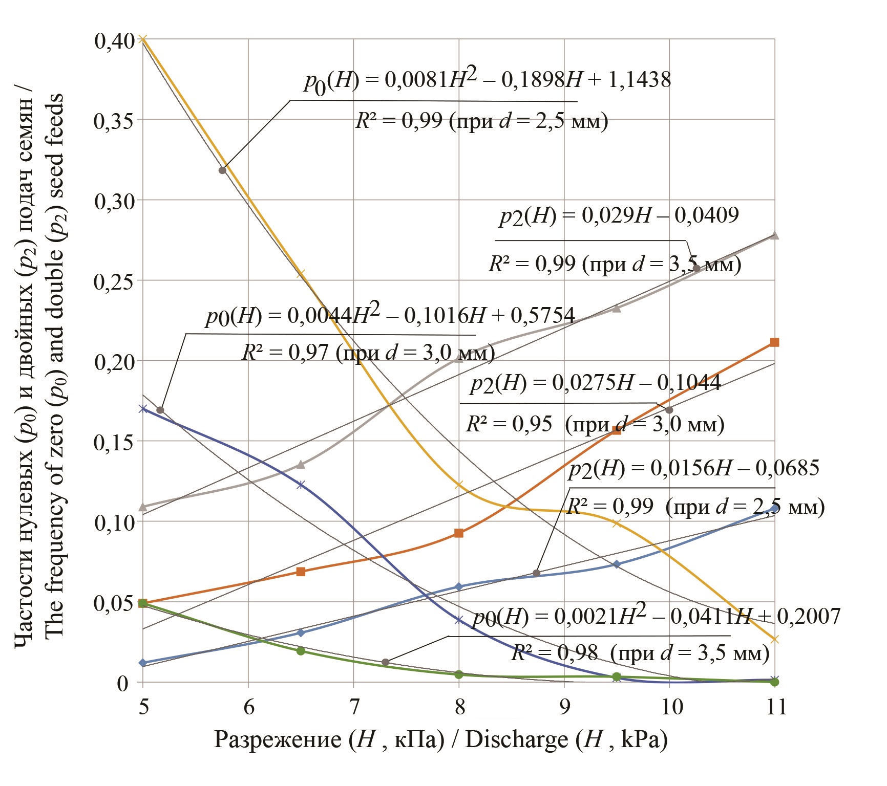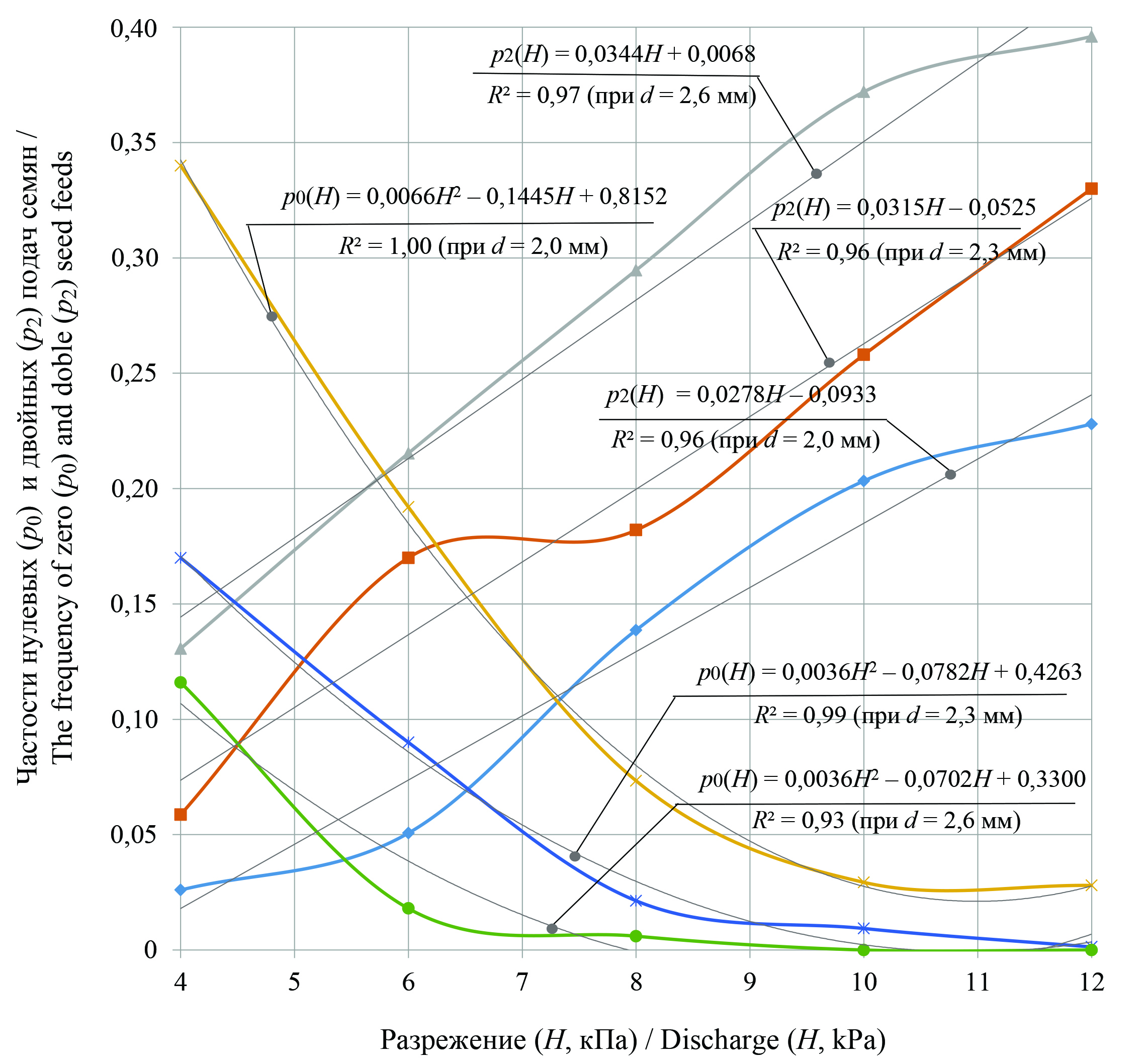 Анализ данных рисунка позволяет сделать вывод, что зависимости изменения частости нулевых подач от разрежения в вакуумной камере аппарата сеялки МС-8 носят квадратичный характер, а зависимости изменения частости двойных подач с высокой точностью (более 96 %) могут быть описаны линейными уравнениями.