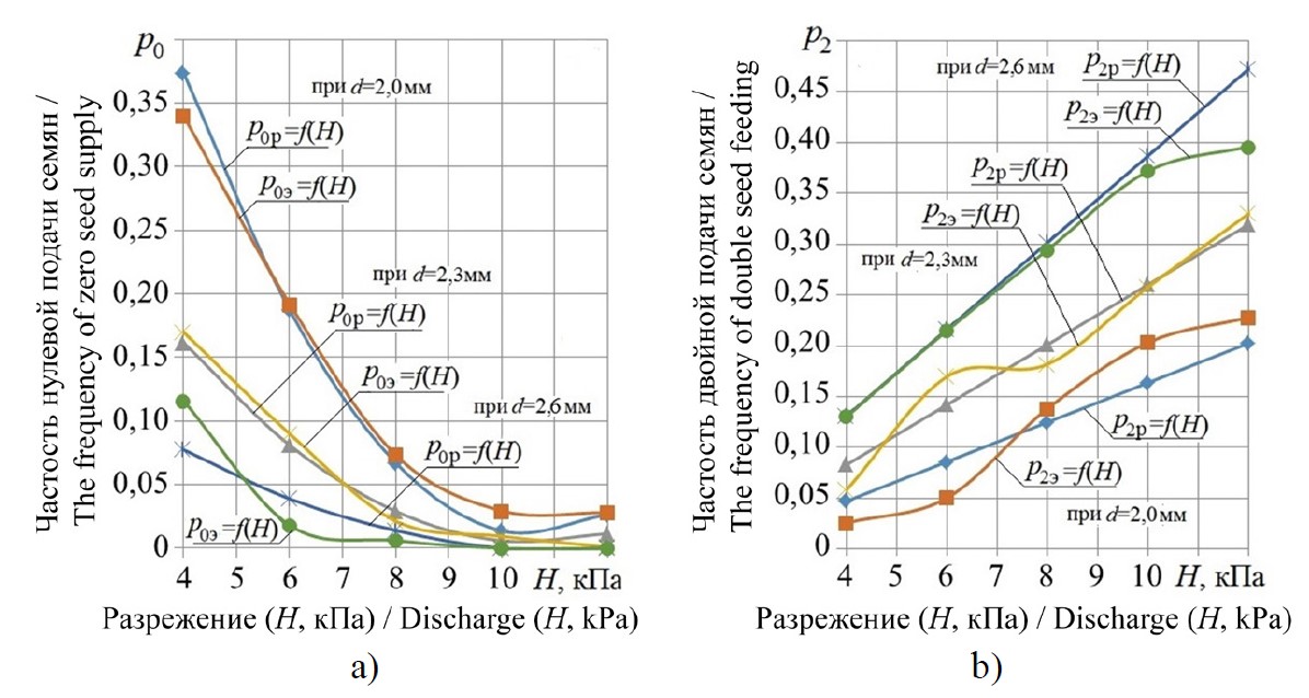 На рисунке 6 представлены зависимости, характеризующие влияние разрежения в вакуумной камере на подачу семян кукурузы при различных размерах присасывающих отверстий, полученные экспериментальным (p0Э и p2Э) и расчетным (p0р и p2р) путями, позволяющие предполагать достаточно высокую сходимость используемых методов. Проверка, проведенная с использованием критерия Пирсона, показала, что расчетный метод позволяет прогнозировать количество групповых подач семян кукурузы классическим высевающим диском (без дополнительных периферийных ворошителей) с достоверностью близкой к единице (0,99). Достоверность сходимости кривых, представленных на рисунке 6а, составила около 80 %. Можно сделать вывод, что выражение (3), адекватно описывающее качественные характеристики частостей образования пропусков при дозировании семян кукурузы, нуждается в количественном уточнении на основе серии дополнительных экспериментов.