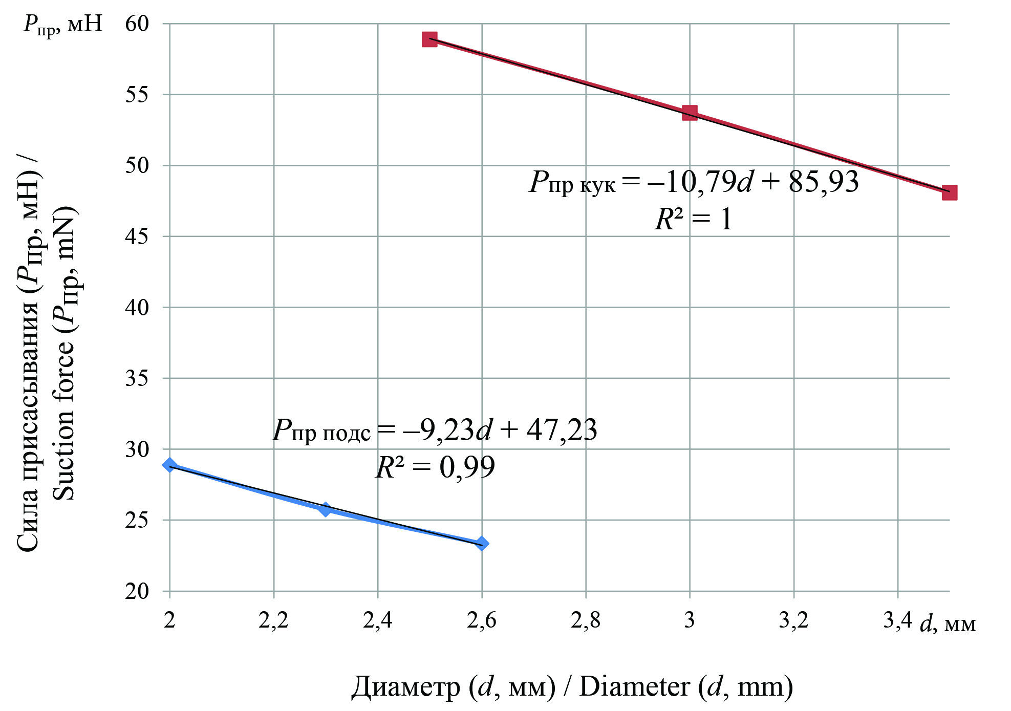Рис. 7. Зависимости влияния диаметра присасывающих отверстий на величину «необходимой» силы присасывания при высеве подсолнечника (при р2 ≈ 0,10) и кукурузы (при р2 ≈ 0,15)