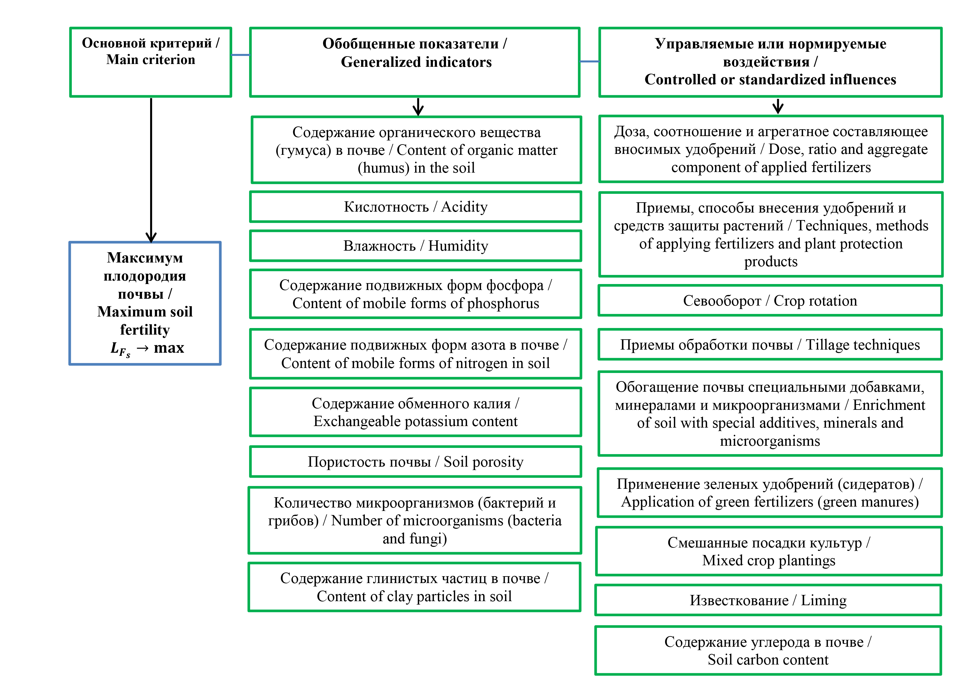 Предложенный нами критерий (максимум уровня плодородия почвы → max) обеспечивает комплексную оценку уровня плодородия почвы с учетом наиболее весомых показателей, перечень которых приведен на рисунке и используется при расчетах по формуле (1).
