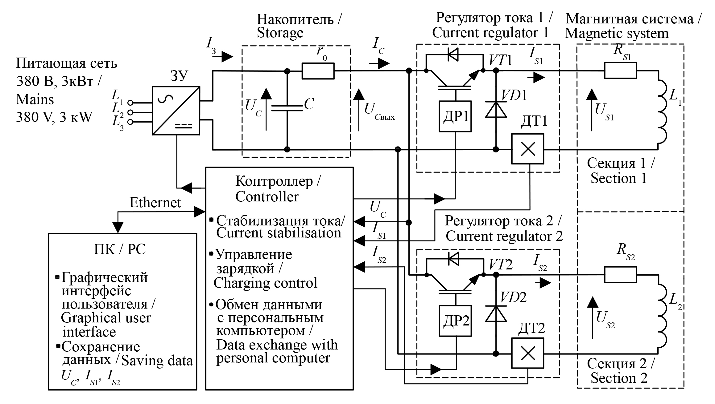 Источник питания состоит из накопителя и двух параллельно подключенных к нему регуляторов тока понижающего типа9, стабилизирующих ток в обмотках магнитной системы. Система управления источником включает в себя контроллер и персональный компьютер.