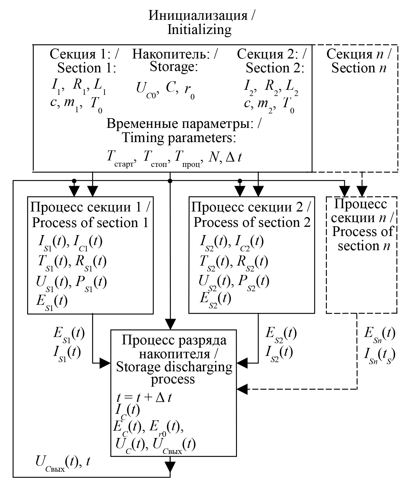 В процессах секций 1 и 2 описывается поведение тока в обмотках, работающих совместно с регуляторами тока, а также вычисляются все связанные с ними переменные величины. К ним относятся потребляемый от накопителя ток, потребляемая обмоткой мощность, ее температура и сопротивление, а также энергия, выделяющаяся на ее активном сопротивлении. Далее, в процессе разряда накопителя, вычисляется полная потребляемая энергия, описывается поведение выходного напряжения накопителя, вычисляется выходное напряжение и ток накопителя. Общее время t для всех процессов вычисляется в процессе 3. Так как напряжение и ток накопителя вычисляется на основании суммарной энергии, потребленной всеми секциями, в данной математической модели может быть любое количество процессов, описывающих поведение тока в секциях.