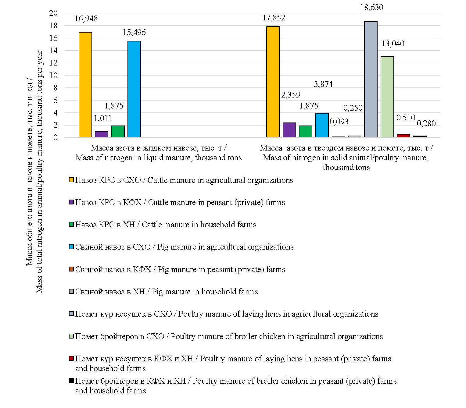 Fig. 1. Mass of nitrogen and carbon in animal/poultry manure generated in North-Western Federal District in 2022