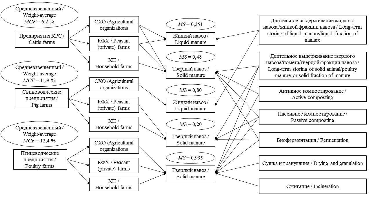 Реализация данного подхода требует сбора детальной информации о технологиях содержания животных/птицы и технологиях переработки навоза/помета, которую необходимо получать непосредственно у сельхозтоваропроизводителей. Учитывая заделы ИАЭП – филиала ФГБНУ ФНАЦ ВИМ по научным исследованиям в Северо-западном федеральном округе (СЗФО) и накопленную большую базу данных, дальнейший расчет выполнен на примере СЗФО.