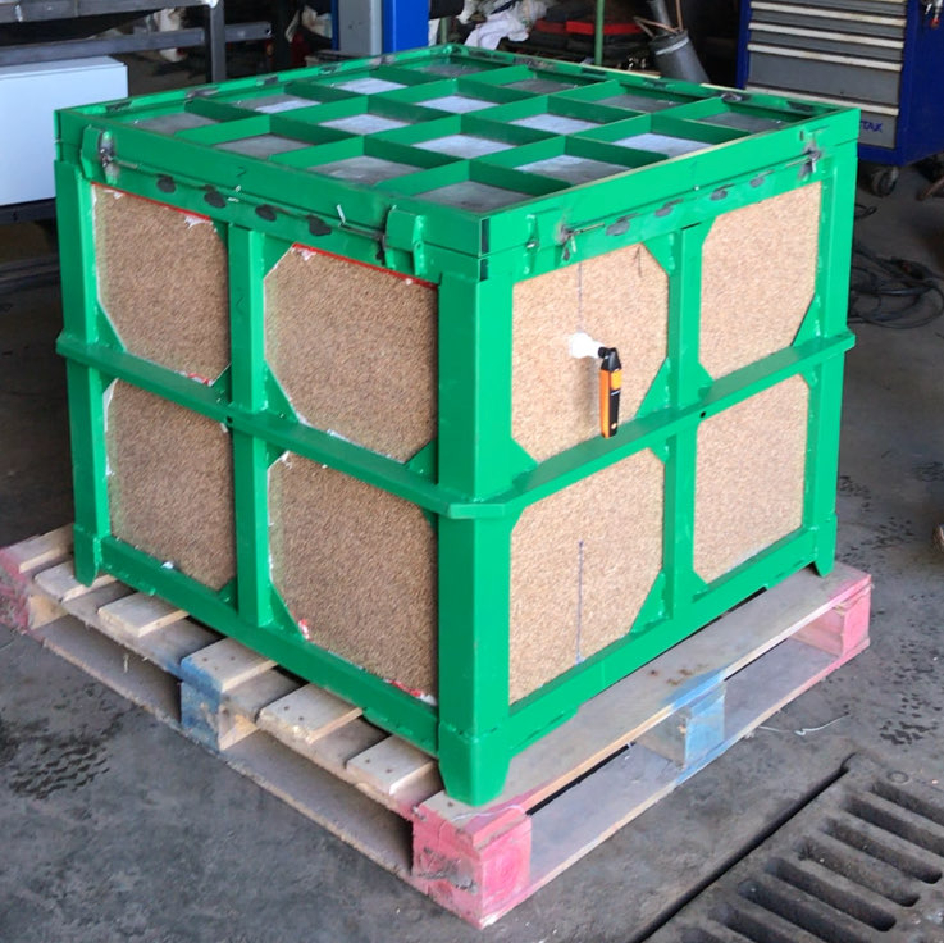 В процессе исследования был разработан многофункциональный контейнер для первичного семеноводства зерновых культур, габариты которого составили 1000х995х820 мм, а вместимость – 0,5 м³. Он включает каркас с боковыми стенками, перфорированные днище и крышку, возможность эксплуатации с селекционно-семеноводческим комбайном, вилочным погрузчиком, тельфером, функцию вращения кантователем в процессе сушки или пересыпания семян из него (рис. 1).
