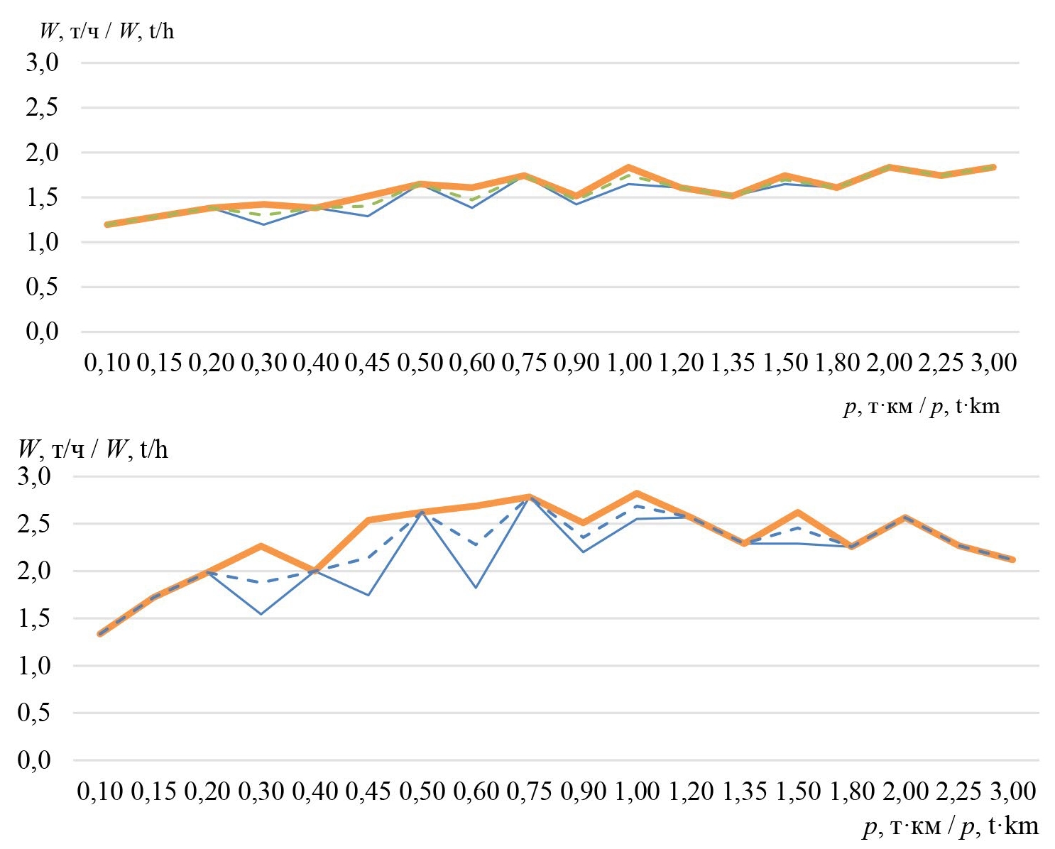 Fig.6. Graphs of changes in productivity of Belarus 622 tractor with 1PTS-2 semi-trailer when using a sack for 50 kg of wheat (top) and a multifunctional container (bottom)