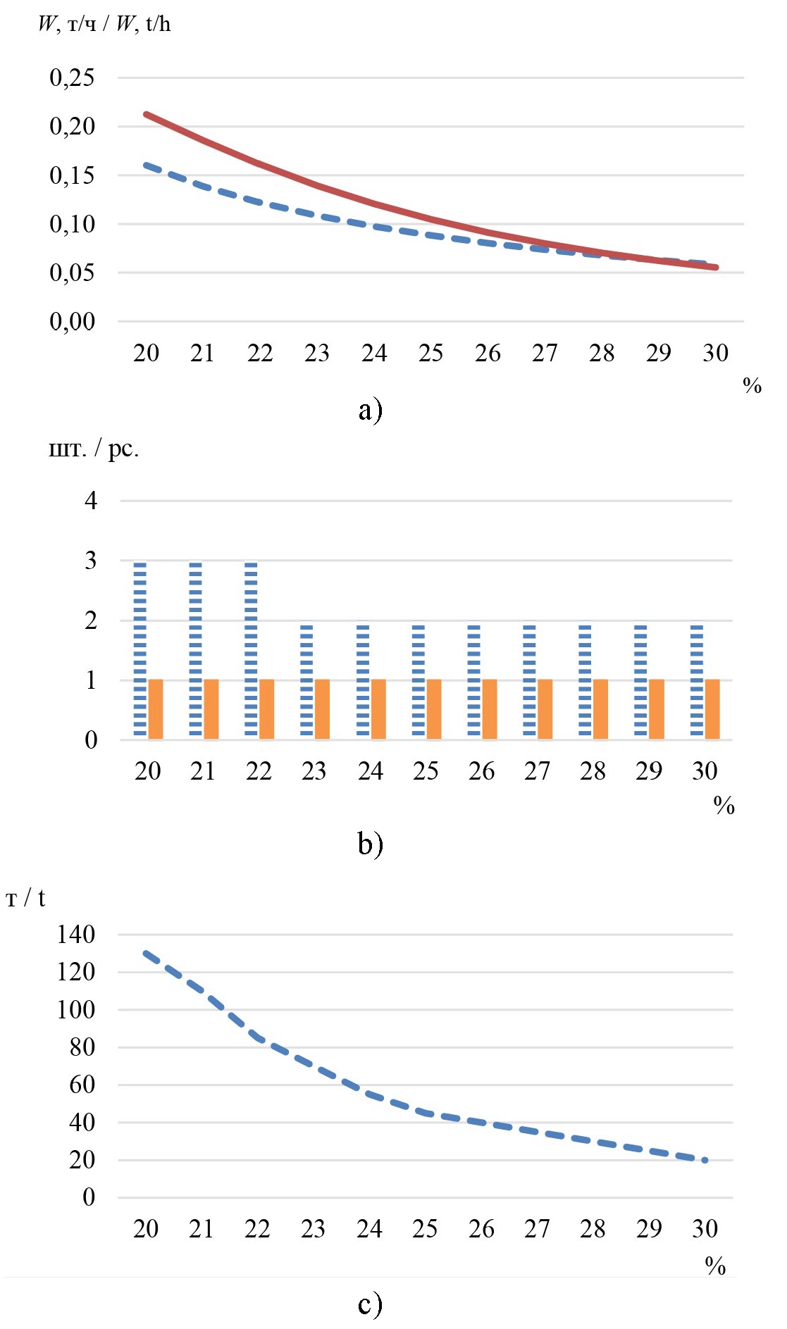 Рис. 8. График изменения производительности (a), потребного количества (b) и годового условного объема работ (c) зерносушилки на базе зерносушилки лотковой СЛ-0,3х2 при использовании мешкотары на 50 кг по пшенице (штриховая линия) и многофункционального контейнера (сплошная линия)