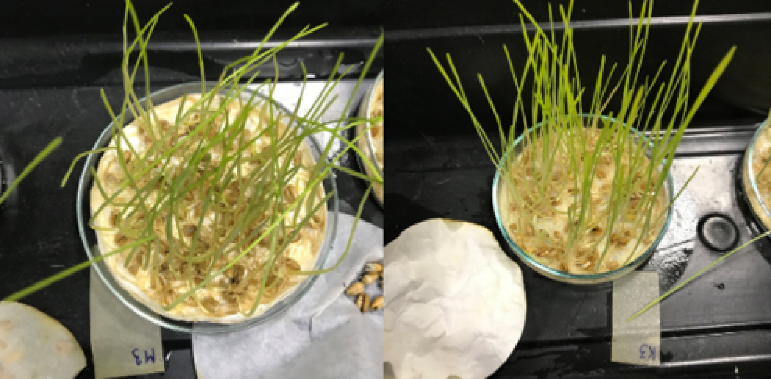 Рис. 9. Пророщенные семена яровой пшеницы «Рима», хранящиеся в мешках (слева) и многофункциональном контейнере (справа)