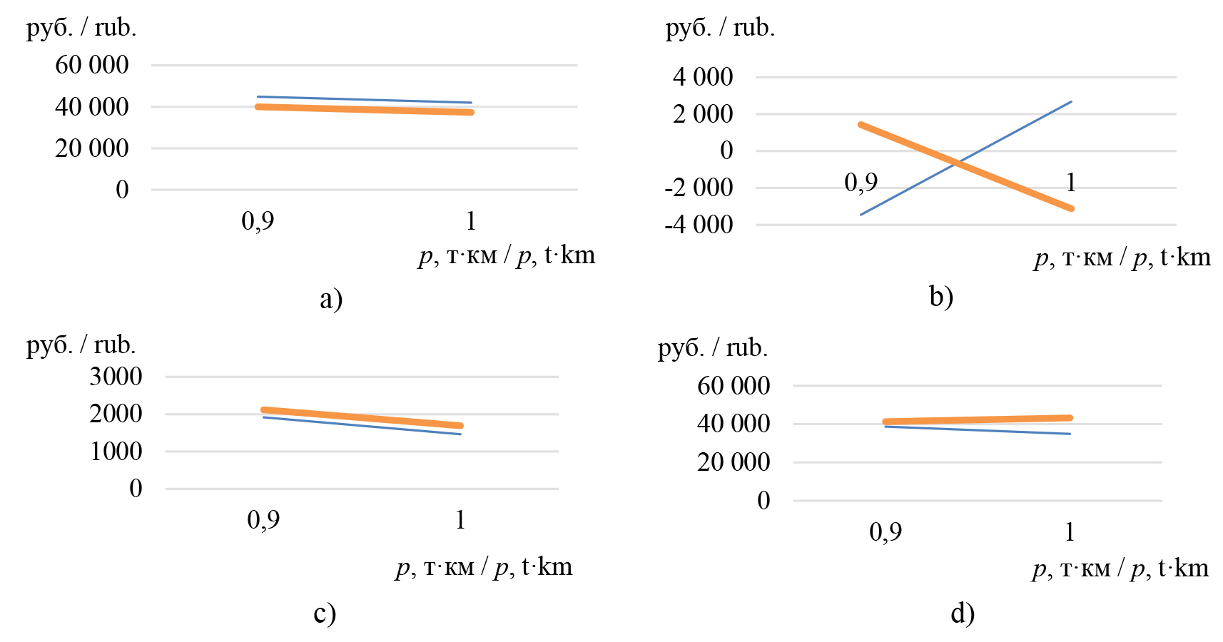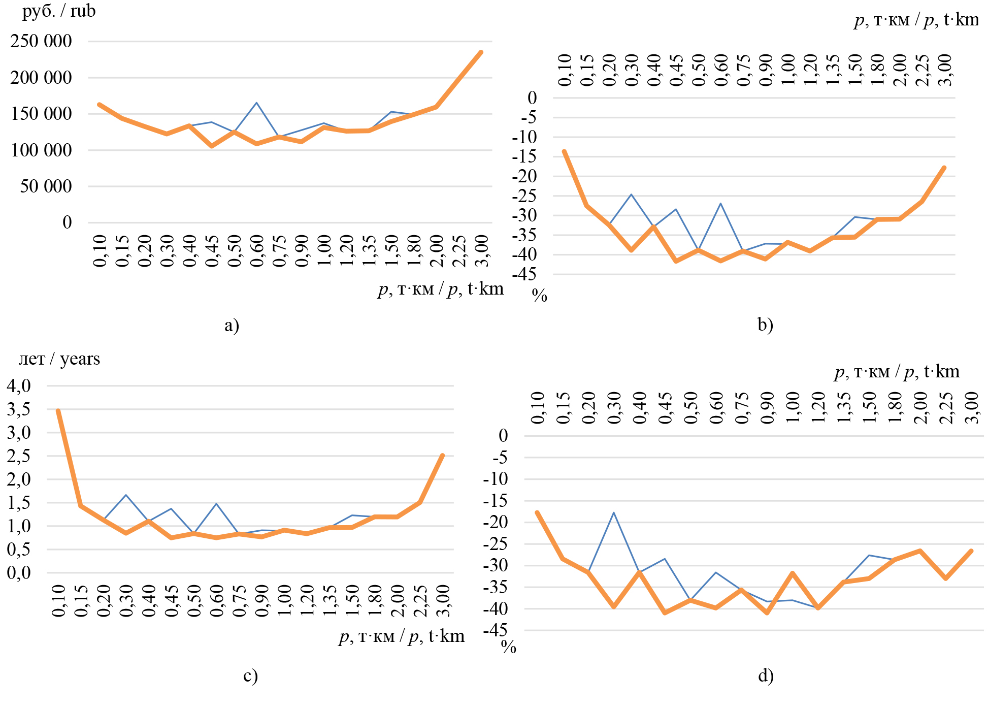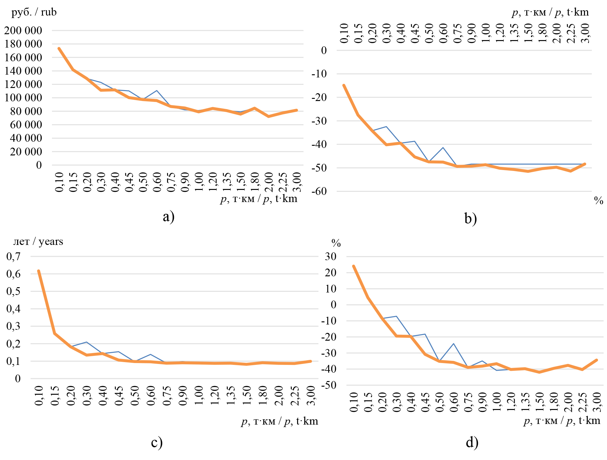 Удалось выяснить, что снижается себестоимость выполнения работы на годовой условный объем работ, срок окупаемости капиталовложений и потребность в источниках энергии, однако, изменение экономии затрат может не являться прямо пропорциональным изменению производительности. При удельном грузообороте p = 1 тк⋅м экономия затрат при меньшей производительности превышает экономию затрат при большей производительности, хотя разница становится менее заметной по мере обобщения показателей экономической эффективности: от экономии затрат на единицу техники до срока окупаемости капиталовложений. Это может быть связано с тем, что прирост производительности уборочно-транспортной техники от перехода к многофункциональному контейнеру в условиях показателей удельного грузооборота, обеспечивающих меньшую эксплуатационную производительность, выше по сравнению с условиями показателей удельного грузооборота при большей эксплуатационной производительности. Однако и в этом случае многое зависит от отдельных показателей, из которых составляется сравнительная экономическая эффективность. Например, экономия затрат на оплату труда при транспортировке на годовой фактический объем, которая зависит от изменения производительности транспортного средства, куда входит паллетоместо на 8 мешков или многофункциональный контейнер, при p = 0,9 − 1 т⋅км изменяются, что показано на рисунке 13 а. Экономия затрат на горюче-смазочные материалы изменяется, что показано на рисунке 14 b, а экономия затрат от потерь семян изменяется так, как показано на рисунке 14 c. В свою очередь, экономия затрат на вспомогательные материалы на годовой фактический объем, которые не зависят от изменения производительности комбайна, изменяются так, как показано на рисунке 14 d. Изменения экономии затрат на ремонтно-обслуживающие работы и амортизацию на годовой фактический объем равны нулю. Контуры графиков соответствуют контурам графиков изменения производительности и экономии затрат принятой в расчет техники.