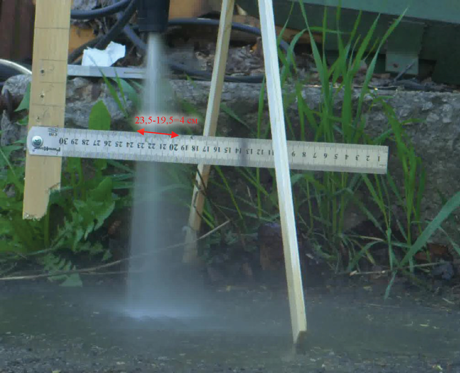 Рис. 4. Измерение ширины сечения струи воды для плоской форсунки на высоте 9 см от среза насадки