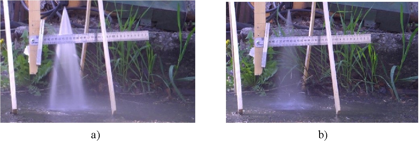 Введение. В статье описан процесс рассмотрения геометрических параметров струи воды в зависимости от ее режима работы и вида форсунки. В рамках исследования гидравлической обработки почвы в приствольных зонах возникла необходимость изучить параметры струи при различных видах насадок. Требовалось определить геометрические параметры потока воды для расчета площади поперечного сечения и определения структурных особенностей формирования струи. Данные характеристики важны для полноценного описания, последующего исследования и расчета действия струи воды при гидравлической обработке почвы. Также они позволяют изучить реальную форму и структуру струи при различных видах форсунки.