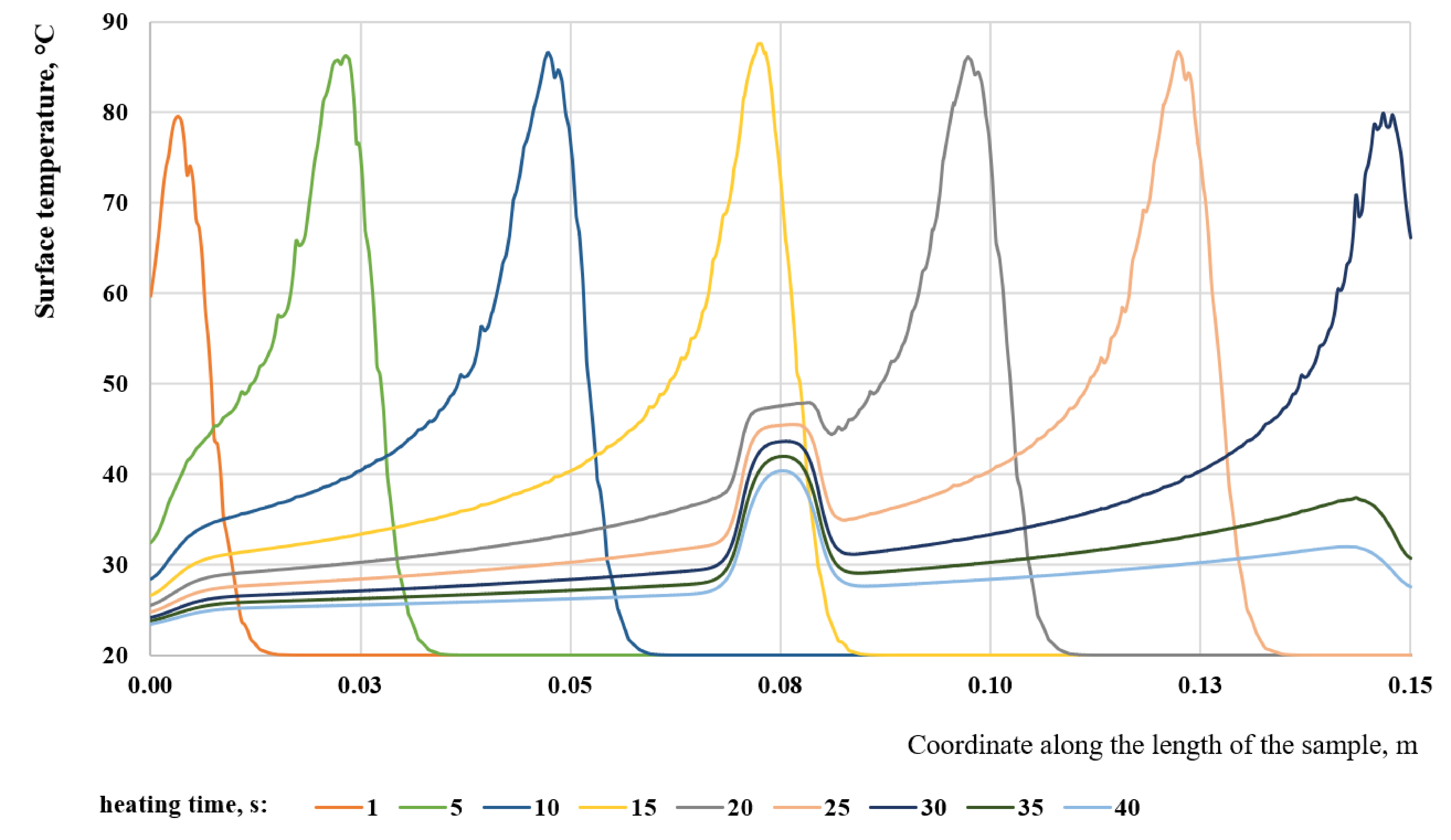 Fig.2. Temperature of the sample surface along its length at different times (s), defdepth = 1 mm, Vlaser = 5 mm/s