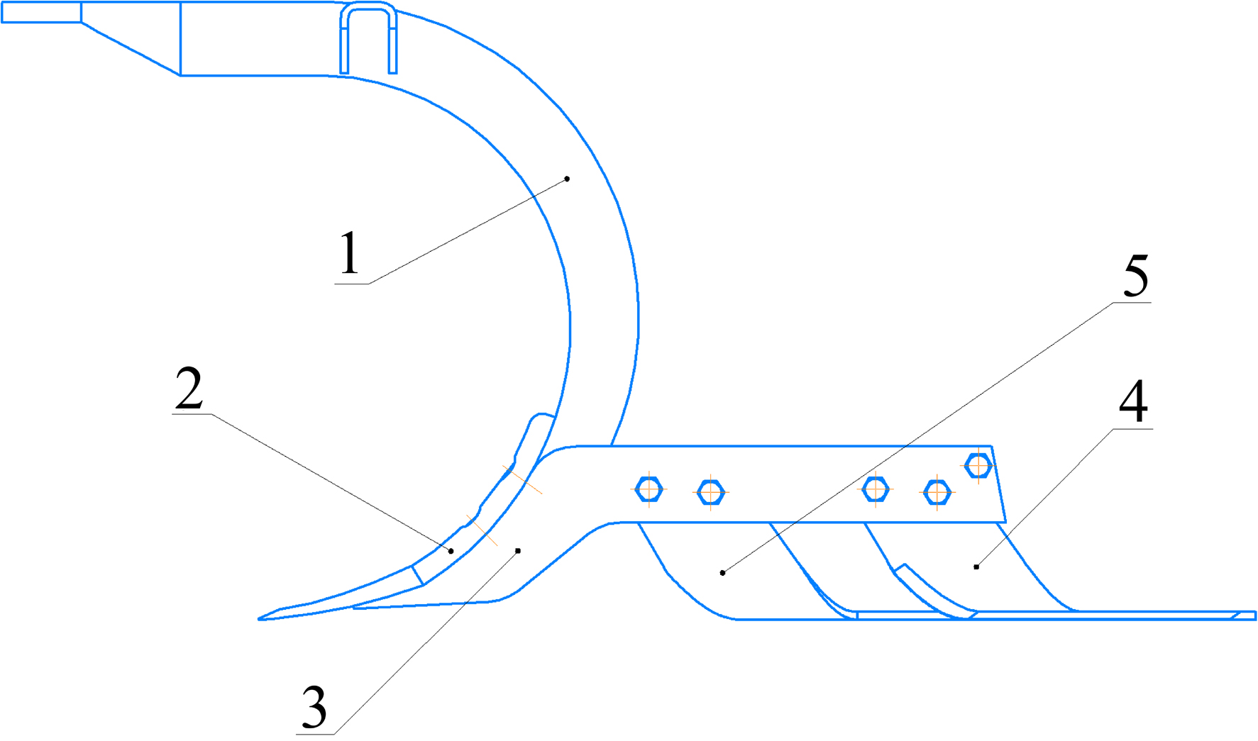 Р и с. 1. Рабочий орган парового культиватора для сплошной обработки почвы: 1 – стойка рабочего органа; 2 – долотообразный нож; 3 – съемный держатель; 4 – левостороннее плоскорежущее крыло; 5 – правостороннее плоскорежущее крыло