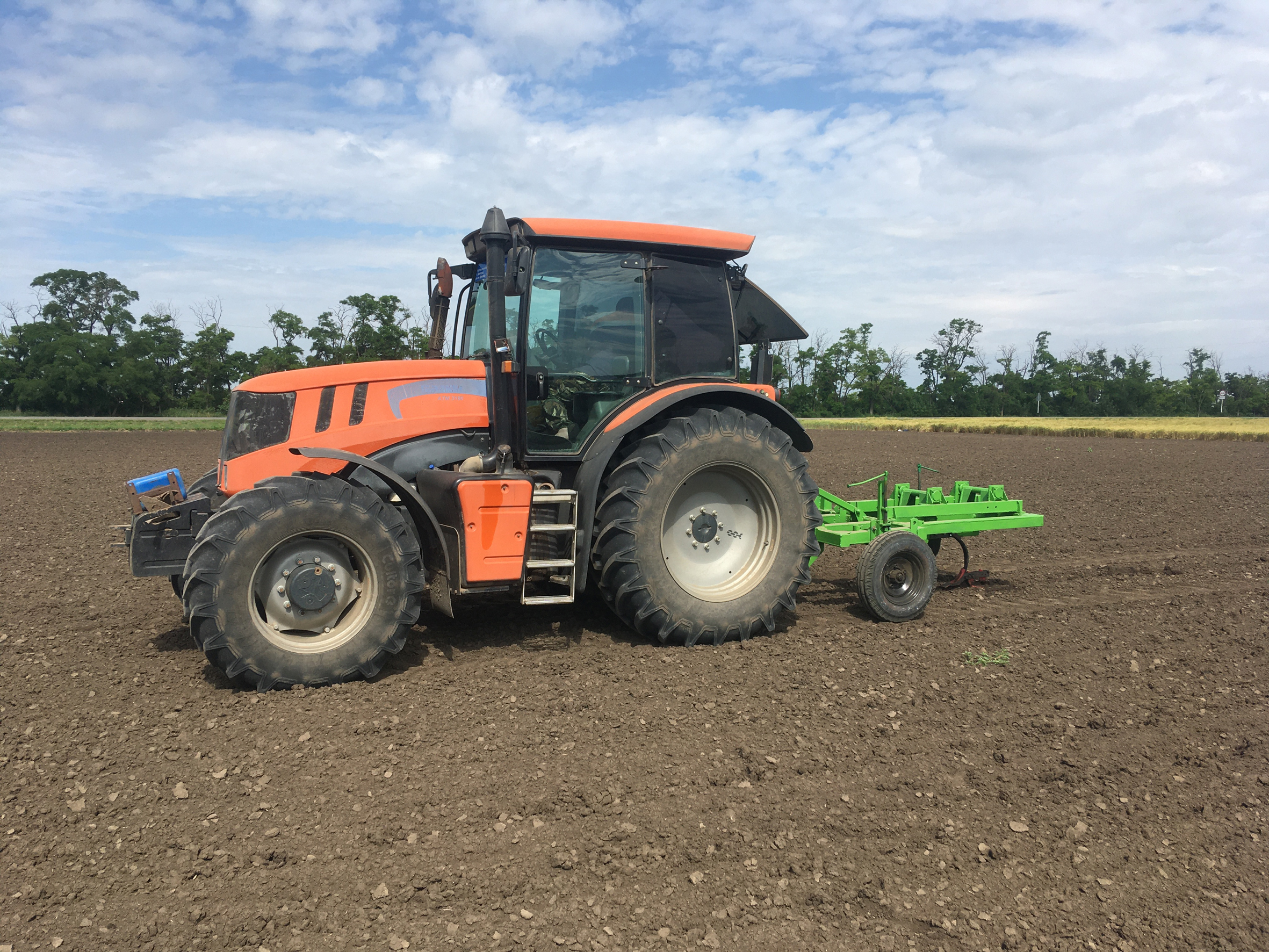 Согласно плану эксперимента, на опытной установке определялась глубина обработки почвы, на рабочем органе устанавливался угол крошения левостороннего и правостороннего плоскорежущих крыльев, а на мобильном энергосредстве (МЭС) задавалась скорость движения агрегата. В качестве МЭС использовался трактор TERRION ATM 3180М 3-го класса тяги агрегатируемый с экспериментальной установкой (рис. 5).