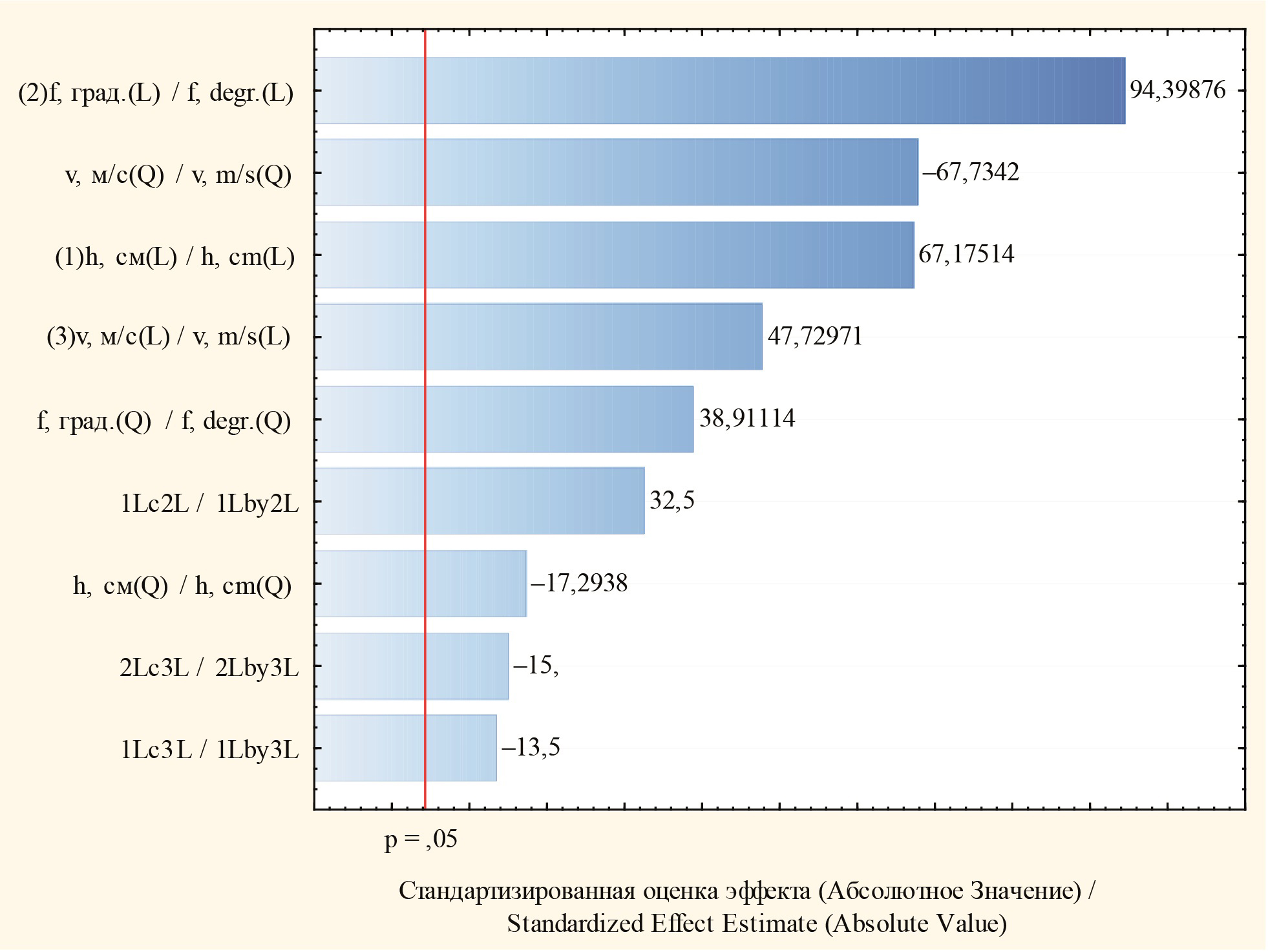 Как видно из гистограммы Парето, наиболее значимым фактором, оказывающим воздействие на создаваемое рабочим органом парового культиватора тяговое сопротивление, является фактор угла крошения левостороннего и правостороннего плоскорежущих крыльев. Математическая модель в закодированном виде будет выглядеть следующим образом:
