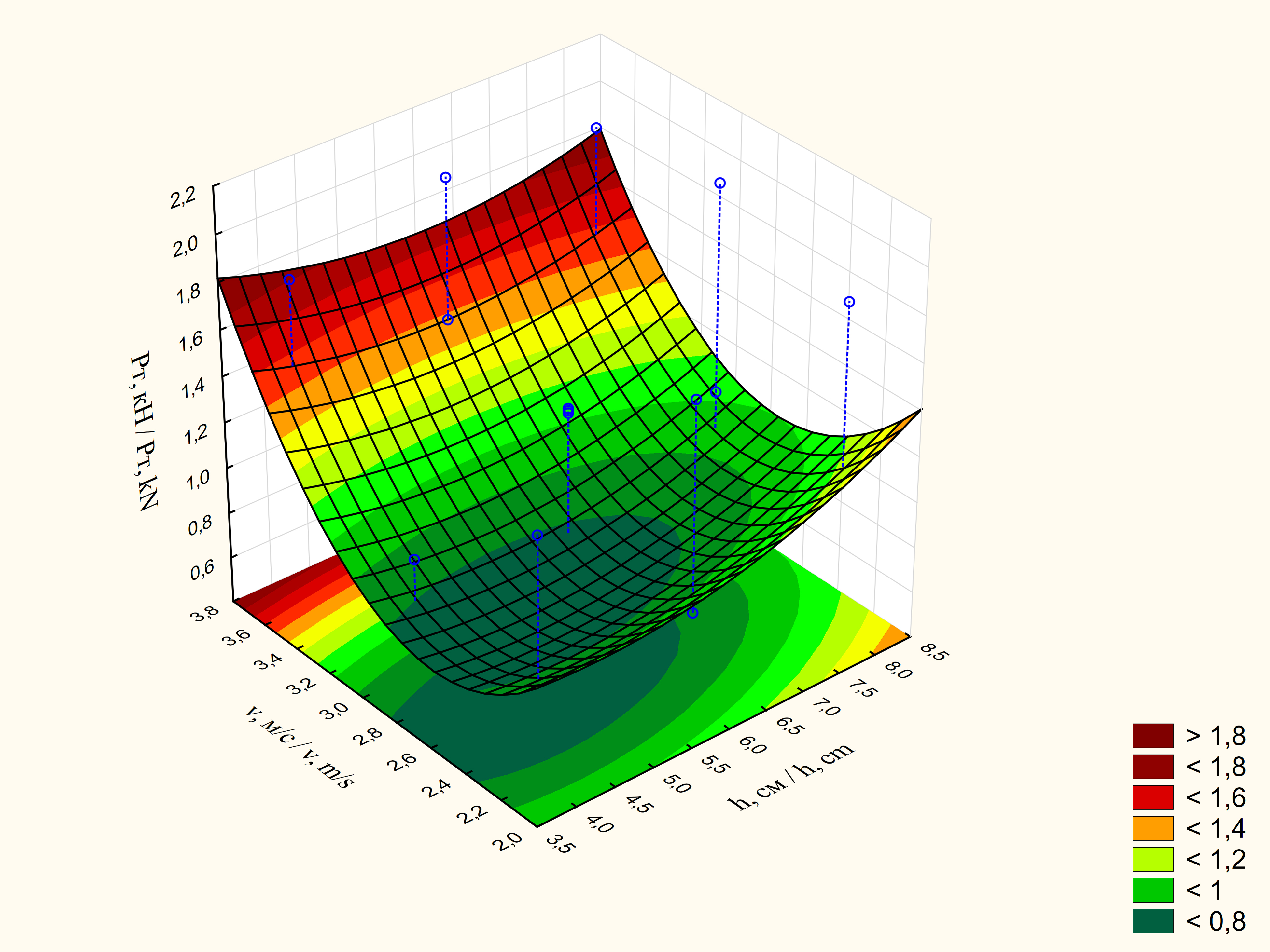 Согласно полученной математической модели, наименьшие показатели тягового сопротивления PT = 0,72 кН достигаются при глубине обработки почвы h = 4 см, угле крошения левостороннего и правостороннего плоскорежущих крыльев рабочего органа f = 0° и скорости движения агрегата v = 2,6 м/с. Угол крошения левостороннего и правостороннего плоскорежущих крыльев рабочего органа рекомендуется принять как f = 0°, а скорость движения агрегата – как v = 2,91 м/с.