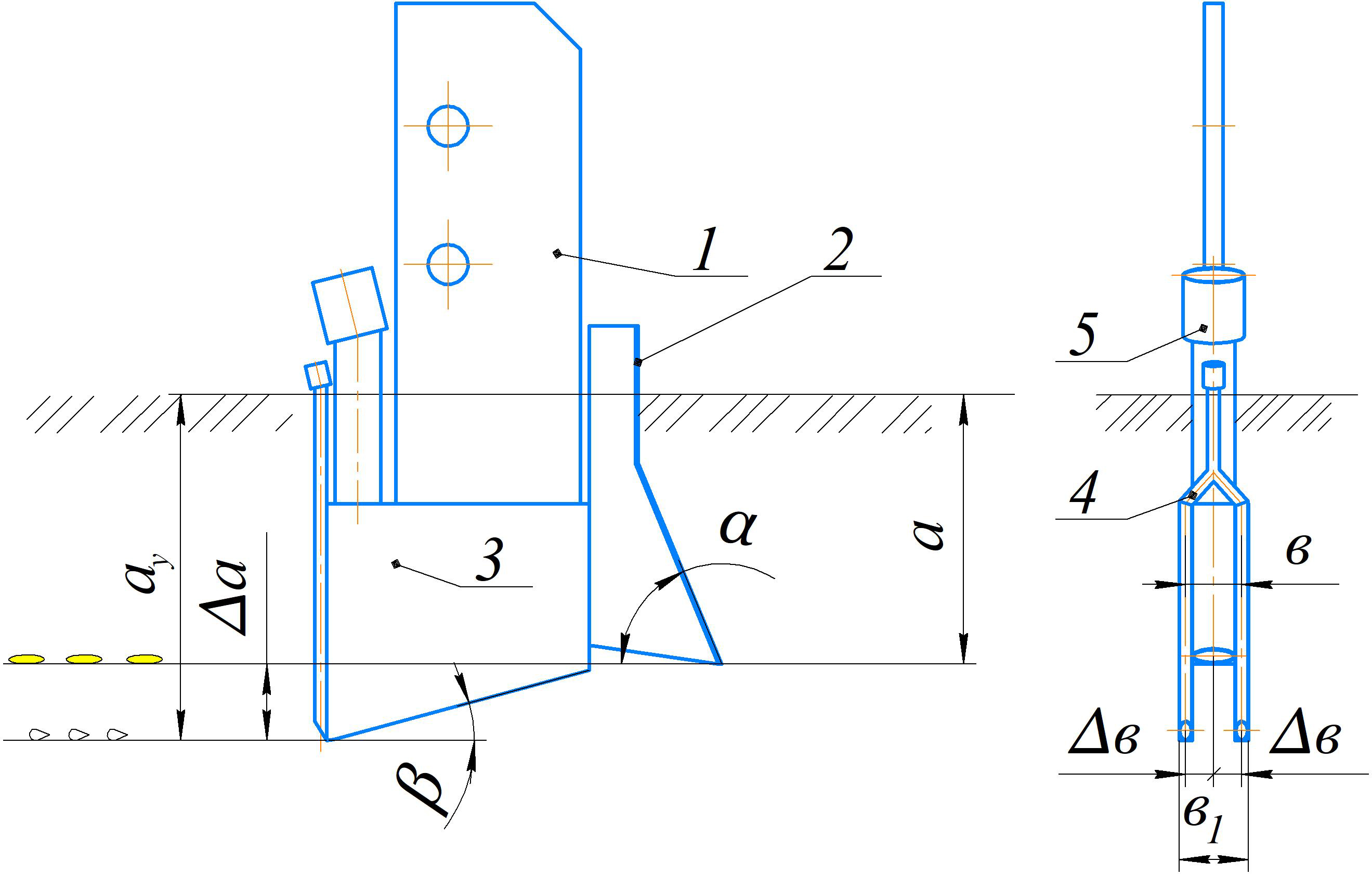 The main design and technological parameters of the dual-level opener are the depth of sowing а, the depth of applying fertilizers ау, the working speed V and the width of the share в. The best-investigated design and technological parameters are working speed, stroke depth of the working body, and the width of the dual-level opener. The influence and dependencies of these parameters on the energy indicators are well known. The optimal position of fertilizers to seeds in our case determined by the vertical and horizontal distances of the soil between the dual-level opener and the furrowers is justified by C. J. Baker [17].