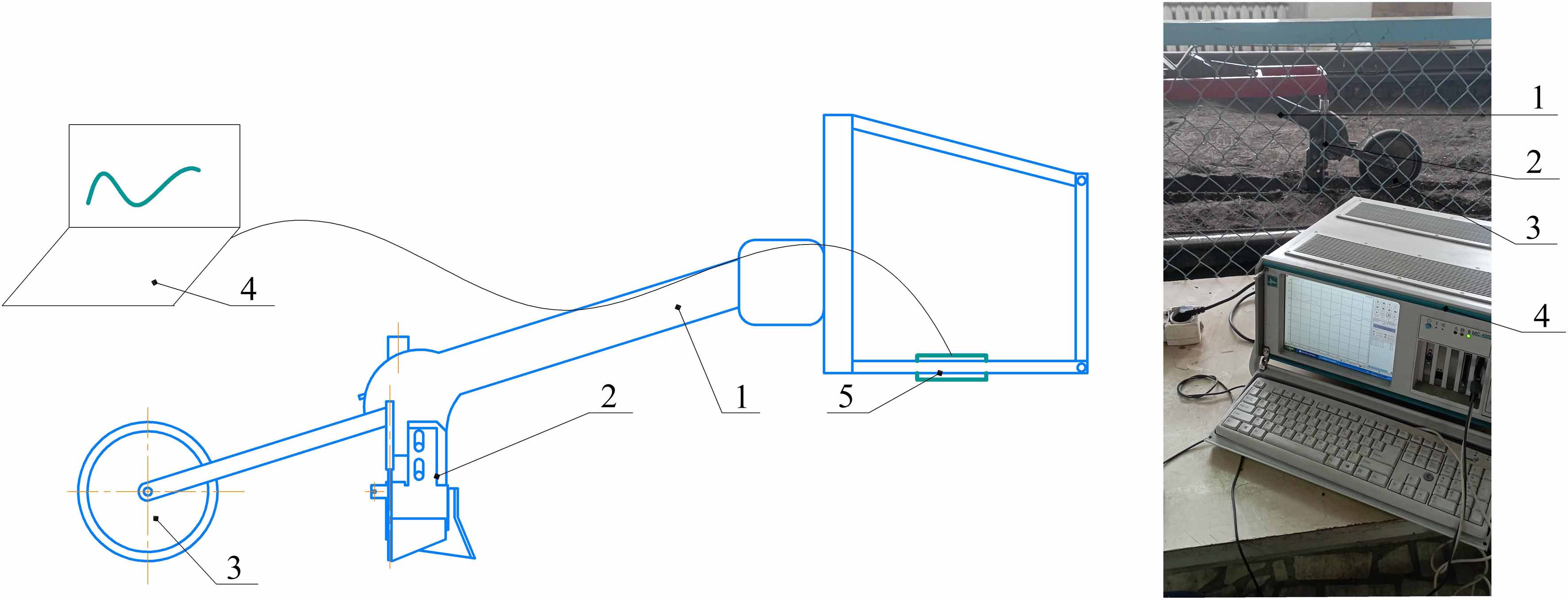 The share 2 of the dual-level opener forms a seedbed in the furrow, where seeds enter through seed ducts 5, and furrowers 3 form two grooves in the soil, where liquid fertilizers enter through tubes 4. After the dual-level opener has passed, the formed furrows are closed with crumbled soil and pressed with a roller [16].