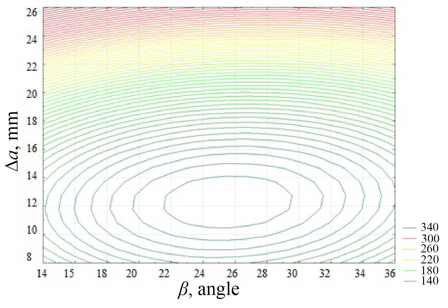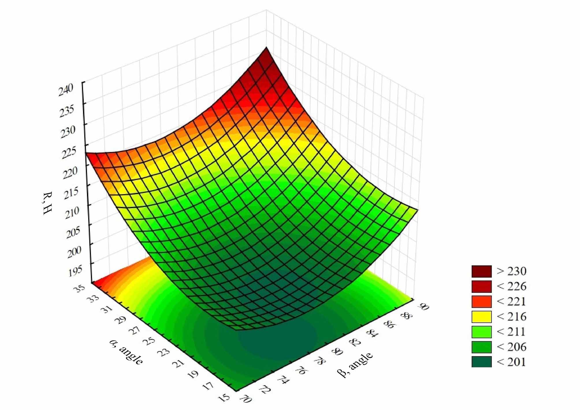 Three measurements are taken for each of the factors: the lower, zero and upper levels. Table 3 shows the values of the experimental factors at these levels and the conditions for conducting a full-factor experiment (FFE). The experiments were carried out according to the plan 32 = 9 for encoded and decoded values of factors. Factor X1 varied between 70о and 90о with a zero level of 80о, factor X2 varied between 15о and 35о with a zero level of 25о.
