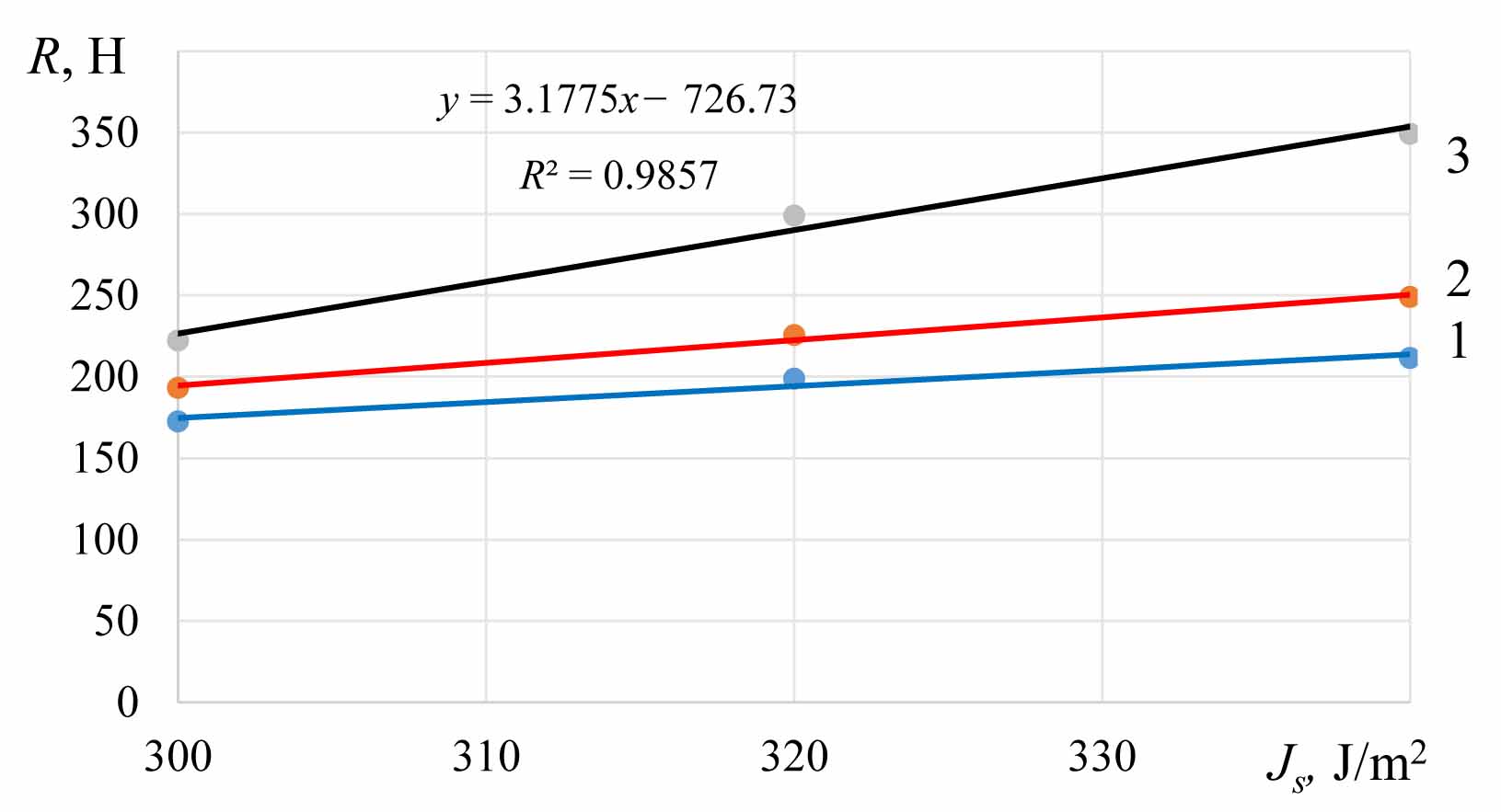 F i g. 12. Dependence of dual-level opener draught resistance R n surface energy of simulated soil JS: 1 – V = 2.0 m/s; 2 – V = 2.2 m/s; 3 – V = 2,4 m/s